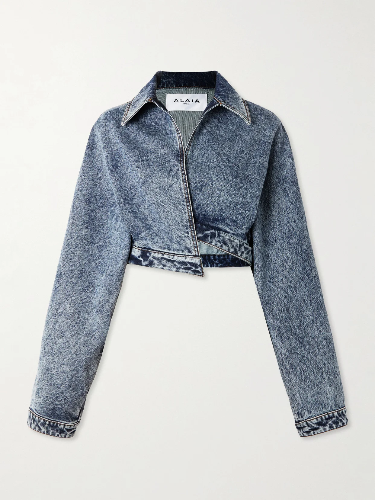 Alaia has the power to elevate any style making it feel luxurious and distinctive. This jacket is made from denim in an asymmetric design and features an integrated spiral belt that cinches at the waist. Complement the cropped fit with high-rise jeans.