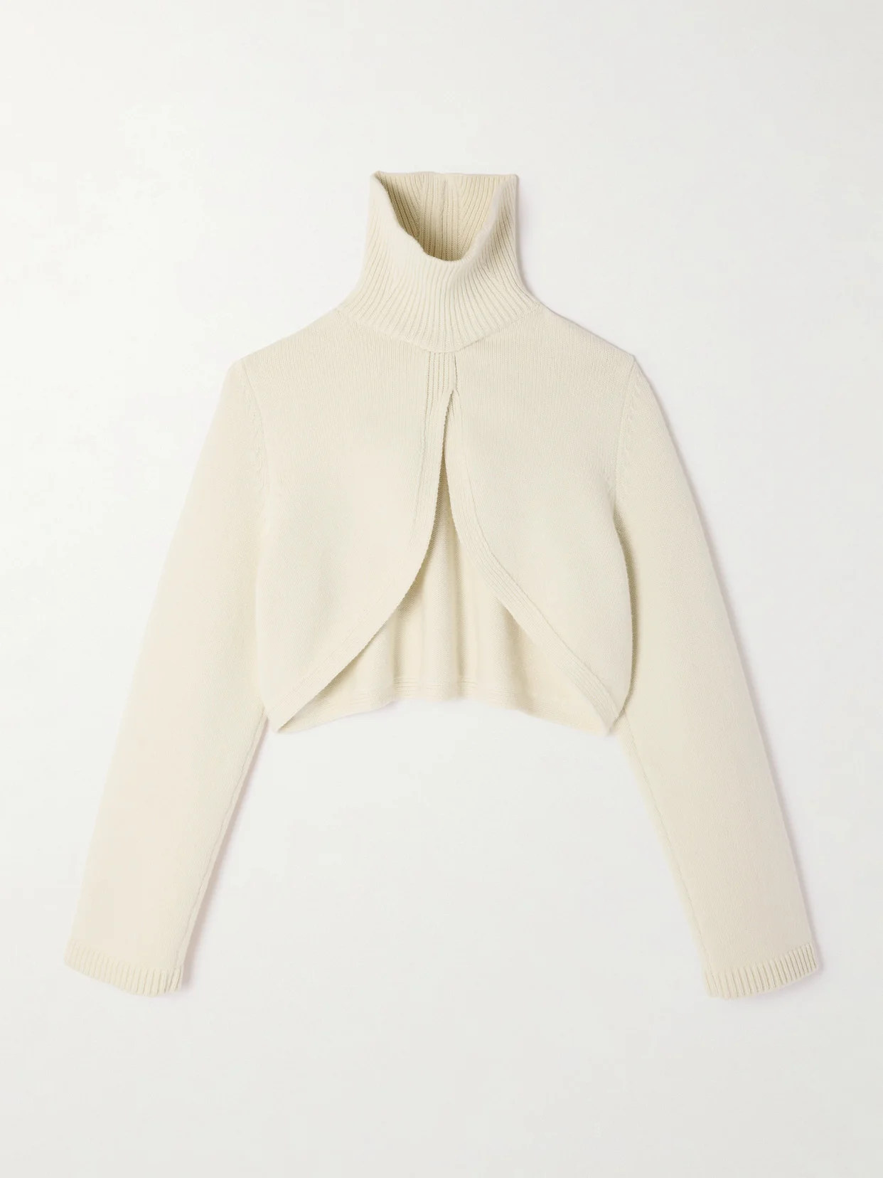 For Alaia's Summer Fall '25 collection, the label looked to the works of sculptor Mark Manders to create statement knitwear like this sweater. It's knitted from cashmere-blend with a cropped, asymmetric hem and topped with a turtleneck. Wear yours with the dynamic tiered spiral skirt.