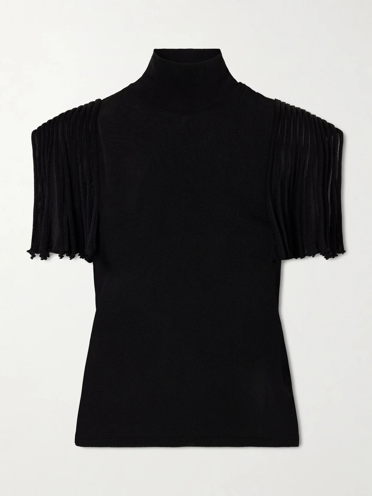 Restraint and expression converge through refined craft in Alaia Spring '26. Made from jersey, this top is designed for a slim fit with subtle shoulder definition and has a turtleneck adorned with side buttons. Wear yours with flared pants.