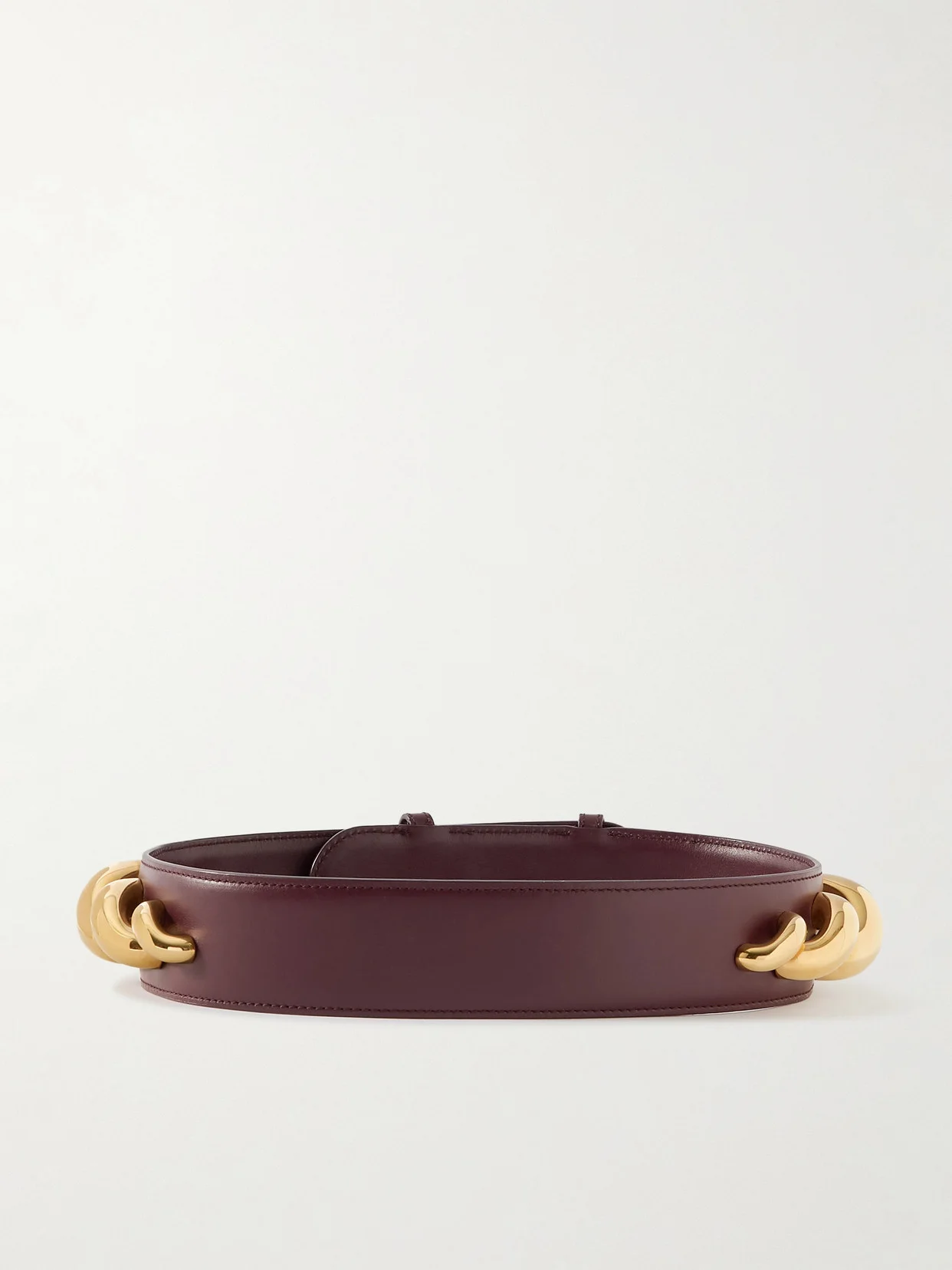 Like so many pieces in Alaia's storied history, this belt is influenced by art and sculpture. It has a wide shape made from smooth burgundy leather and is adorned with gold-tone embellishments that look like they twist into your side.