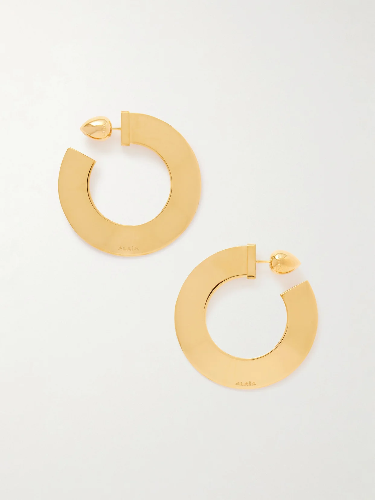Designed to complement the proportions of Alaia's Fall '25 runway looks, these hoop earrings are cast from gold-tone metal in a flat, curved profile. The models wore them with slicked-back hair and minimal makeup.