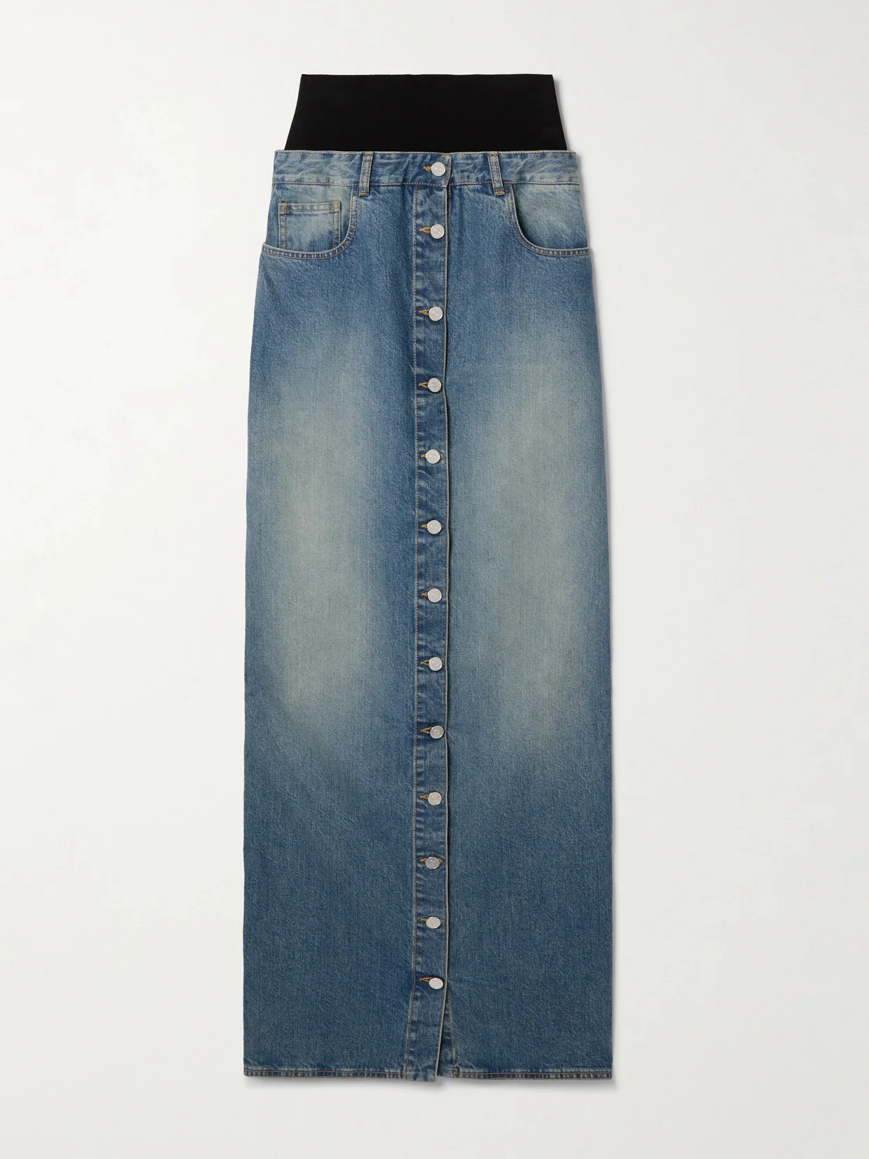 Alaia's maxi skirt is cut from stone-washed denim that's cut for a low-rise figure-hugging shape. It's topped with a black jersey panel that sculpts your waist and has buttons through the front - undo a few at the bottom to create a slit.