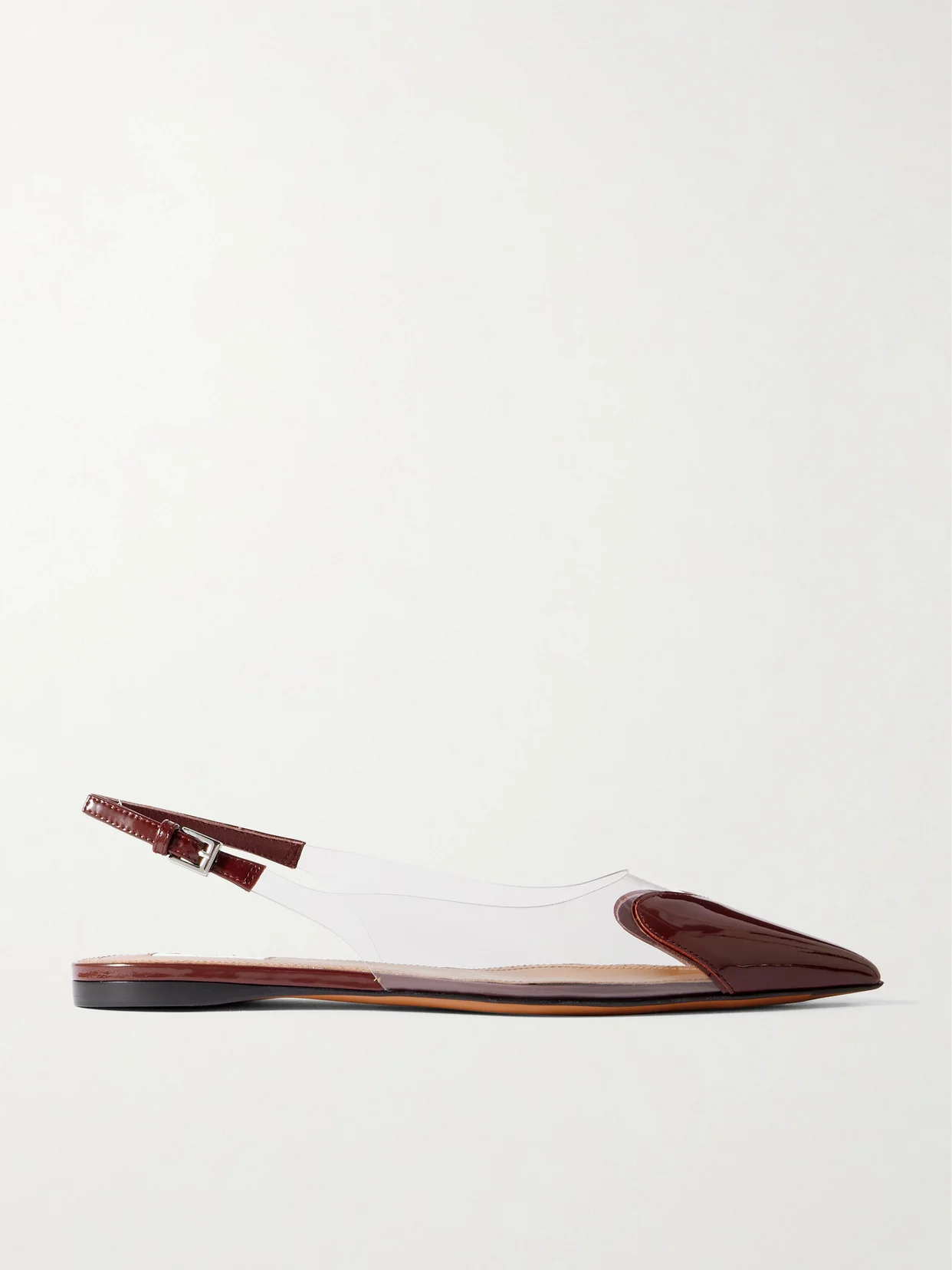 Alaia's aptly named 'Le Caur' flats are designed with pointed toes and curved vamps that resemble hearts. Crafted from clear PU, they're trimmed with burgundy patent-leather and have buckled slingback straps.