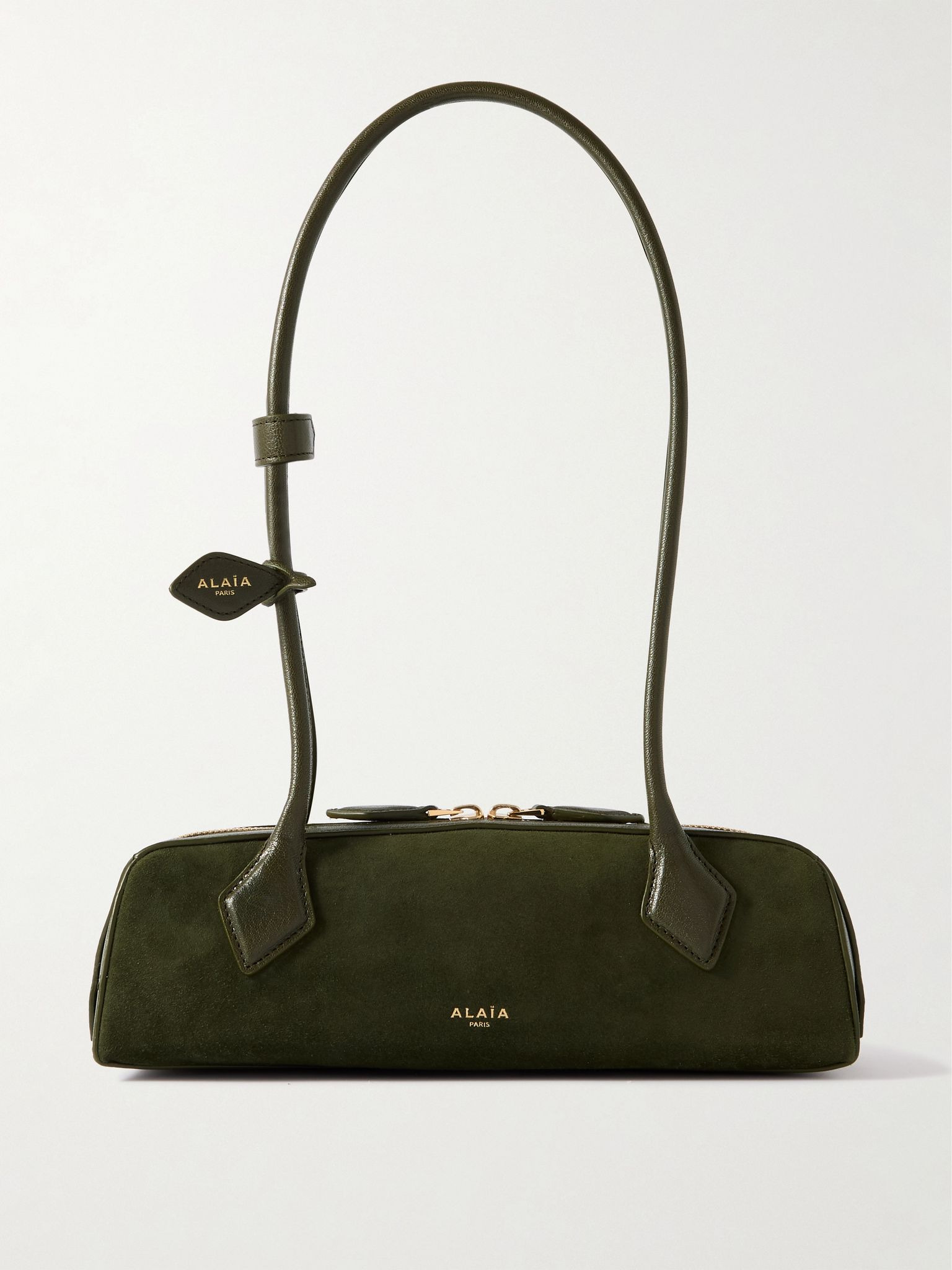 Alaia's 'Le Teckel' shoulder bag takes its name and long, slender shape from the French word for 'dachshund'. Made in Italy from suede, it has tubular leather straps and a logo-embossed luggage tag. Inside, you can fit your keys, phone and lipstain. There's also a slot for your most-used cards. Details & Care - Dark-green suede and leather (Goat) - Shoulder straps - Internal card slot - Suede lining - Two-way zip fastening along top