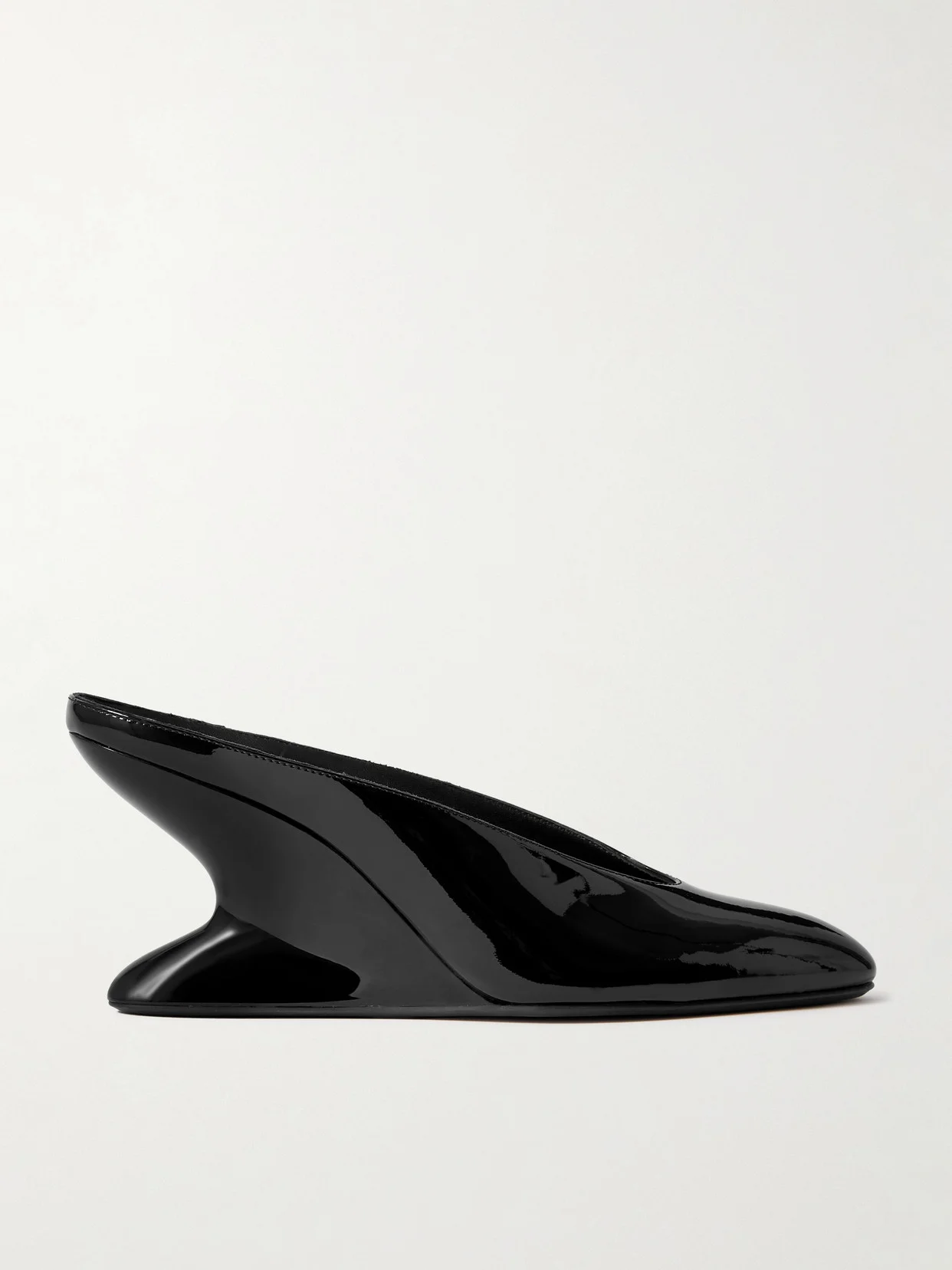 Alaia's mules have softly curved, sculptural wedge heels that feel distinctly modern and architectural. They've been made in Italy from glossy patent-leather and have low-cut vamps and rounded toes. Wear yours with tailoring or one of the Maison's dresses.