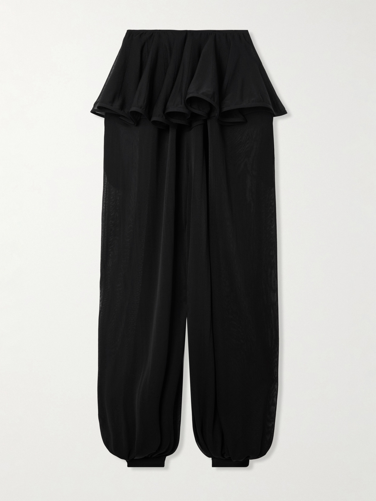 The rotunda at New York's Solomon R. Guggenheim Museum provided the perfect backdrop for Alaia's Spring '25 collection, which celebrates the brand's connection with the city. Worn on the runway with a bandeau top, these pants are cut from floaty georgette that's layered with ruffles at the waist to create a peplum effect. The wide legs taper at the ankle to emphasize their sculptural volume.