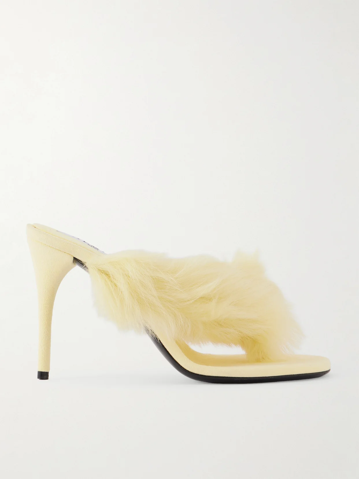 Alaia explores shape and texture in its luxurious designs - these mules are reimagined with an unexpected cozy twist. Made from fluffy shearling in a buttery yellow hue, they have rounded toes and are balanced on 90mm stiletto heels.