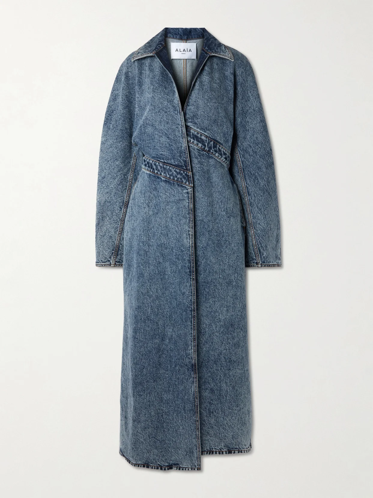 The sculptural spiral waist of Alaia's coat mimics the iconic rotunda at New York's Solomon R. Guggenheim Museum which fittingly served as the backdrop to the label's Spring '25 runway. Made from acid-washed denim, it has a notch collar and asymmetric hem. Take cues from the show styling and wear yours as a dress.