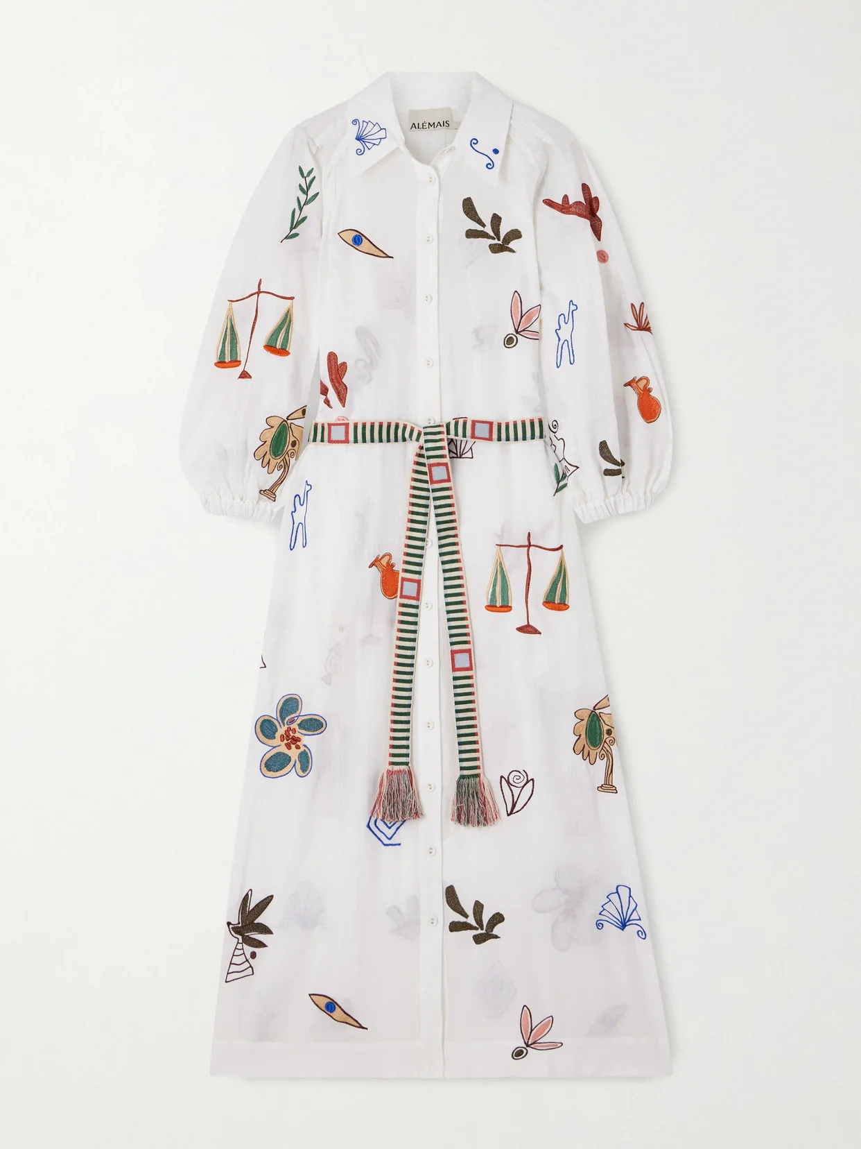 ALEMAIS' 'Mina' dress is embroidered with playful motifs designed by Belgian-Moroccan multidisciplinary brand LRNCE. It debuted on the Resort '26 runway, set in Marrakech, and is made from ramie that'll feel so breezy on warmer days. Define the loose, shirt-inspired shape with the detachable striped belt.