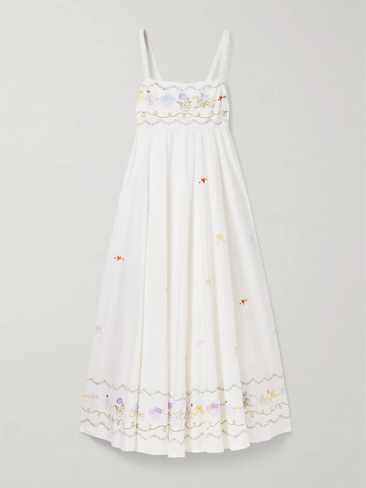 ALEMAIS' 'Giulia' dress is embroidered with a variety of motifs, including colorful flowers, bows and arrow-punched hearts. Cut from organic cotton-poplin, it has stretchy, ruched straps and a shirred back for a comfortable fit.