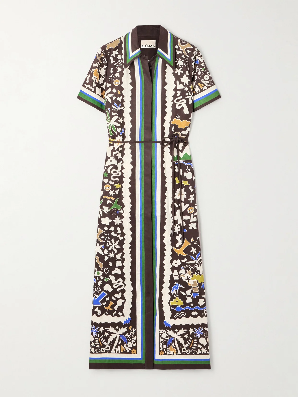 ALEMAIS' midi dress is printed with flora, fauna and abstract shapes - a nod to the Moroccan influences of the Resort '26 collection. Made from breathable linen, it's cut in a relaxed, shirt-style silhouette with a slim belt to shape the waist. Undo a few buttons for an effortless vacation look.