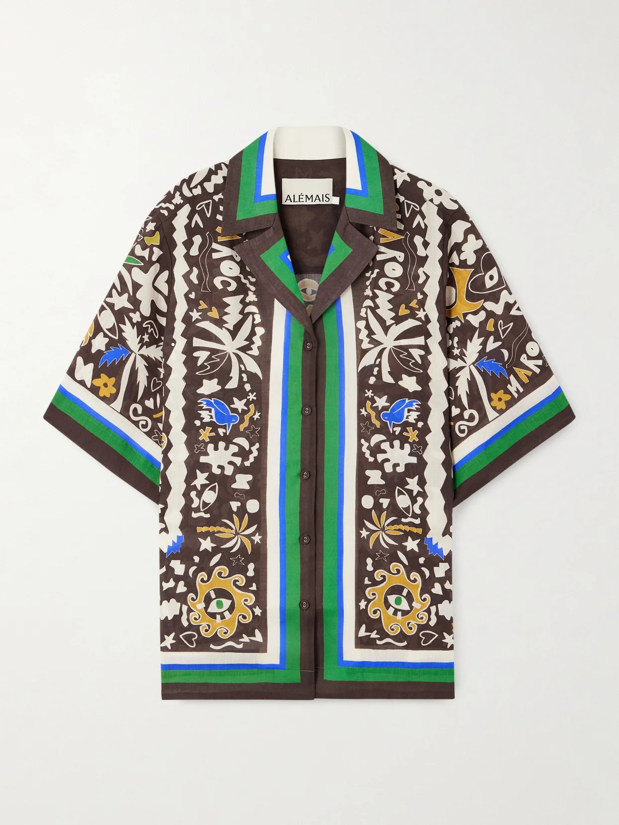 As the name suggests, ALEMAIS' 'Maroc' shirt takes inspiration from the city of Marrakesh and traditional Moroccan artistry. It's cut from lightweight ramie for an oversized shape and is printed with playful motifs, bold lettering and stripes. Wear yours unbuttoned with the coordinating skirt to match the styling on the Resort '26 runway.
