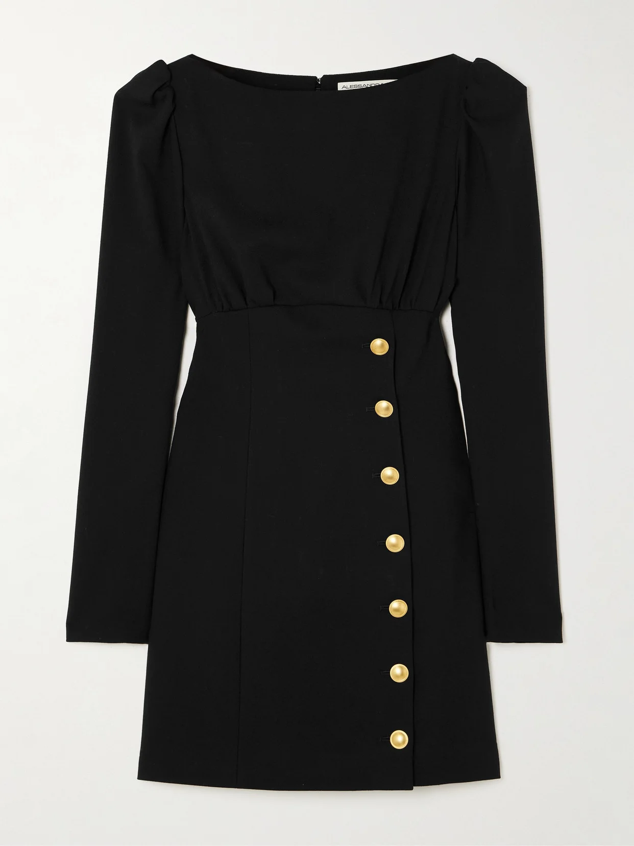 Alessandra Rich's dress has you covered for dinners or date nights. It's cut from soft wool-blend with an elegant gathered, boat neck top with a wrap-effect mini skirt decorated with gold-tone buttons.