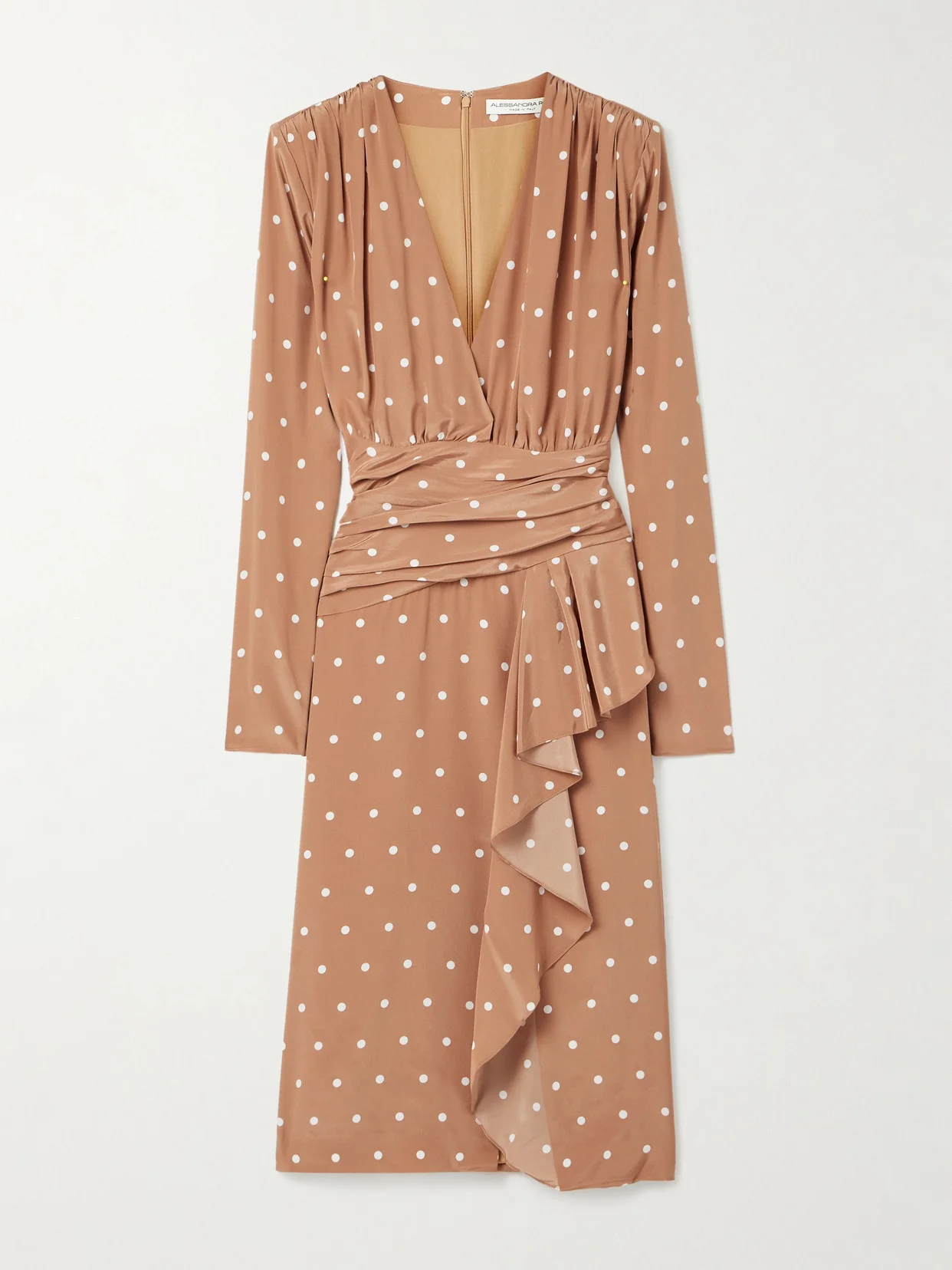 Alessandra Rich draws on historical design references to create her signature romantic pieces, blending vintage charm with a modern sensibility. This midi dress is cut from polka-dot silk crepe de chine that's gathered at the waist for definition and has a cascading ruffled panel tracing the split skirt.