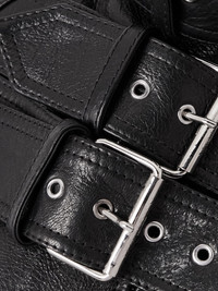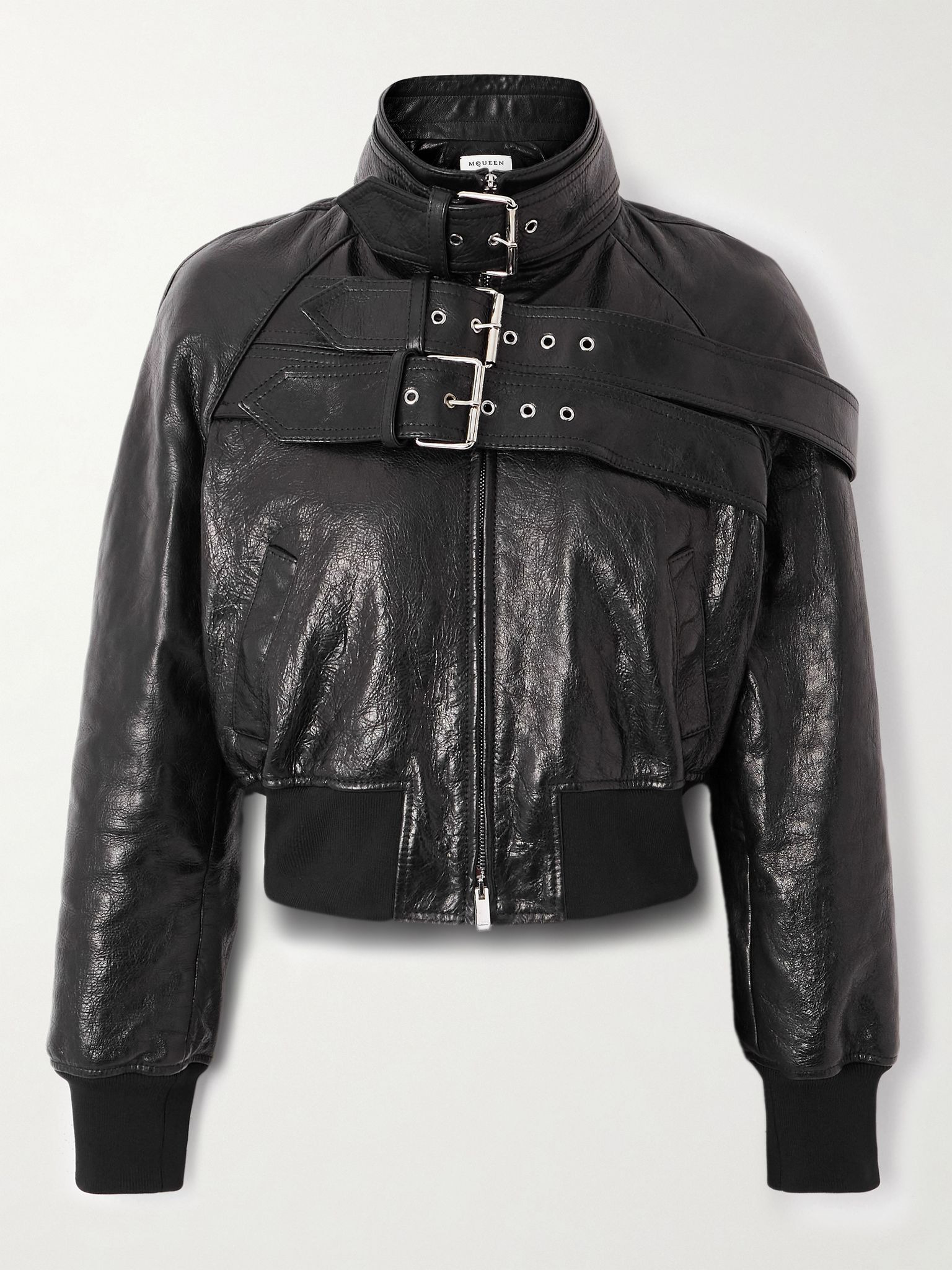 McQueen is renowned for designing exceptionally cool biker jackets interpreted with signature precision and drama. This version features three oversized buckles across the chest for a punkish feel. It's made from leather and has cinching elasticated edges. Size & Fit - Fits true to size, take your normal size - Designed for a slightly loose fit - Ribbed hem - Supple, non-stretchy leather - Model is 175cm/ 5'9" and is wearing an IT 40 Model measurements: - Bust: 85cm/ 33.5” - Waist: 63cm/ 25” - Hip: 90cm/ 35.5” Details & Care - Black leather - Two-way zip fastening at front - 100% leather (Lamb); lining: 100% viscose - Fully lined - Specialist clean