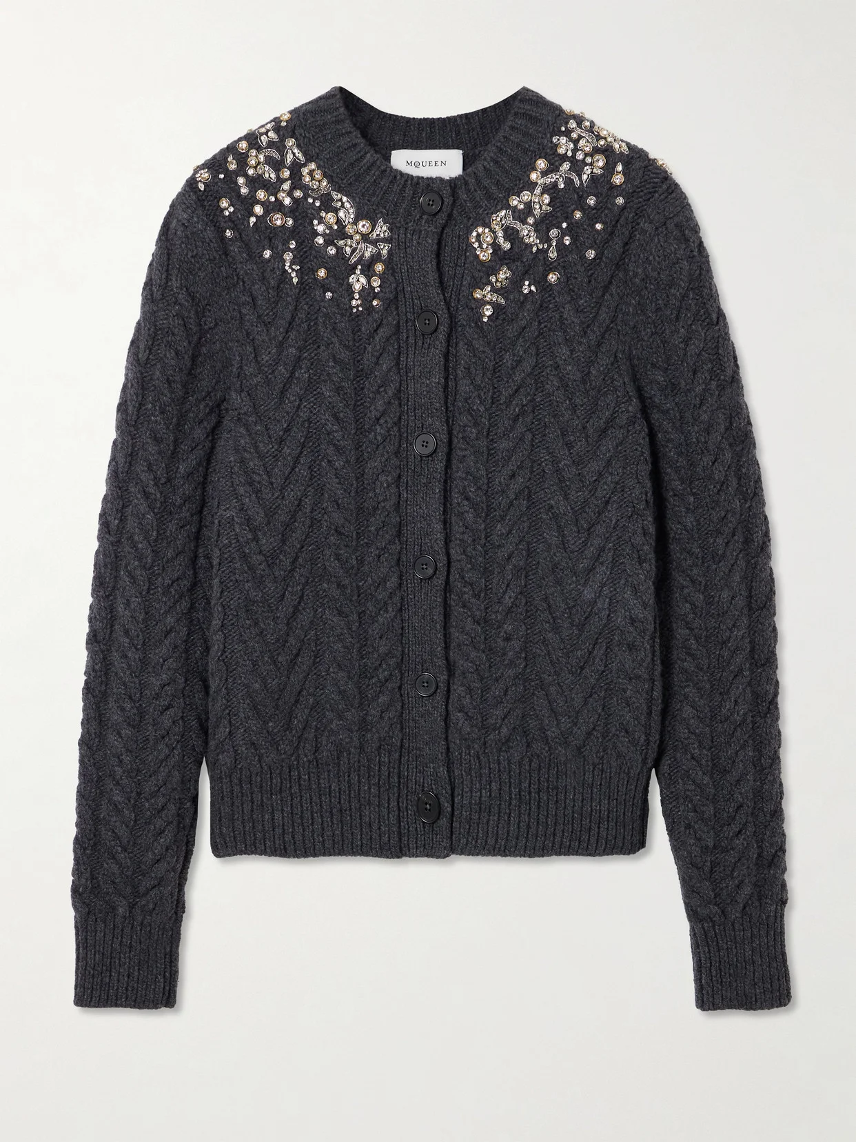 We love McQueen's take on the Aran cardigan. Dusted with pretty crystals across the neckline and shoulders, it's cable-knitted from a luxurious blend of wool and cashmere. Wear with everything from skirts to faded denim.
