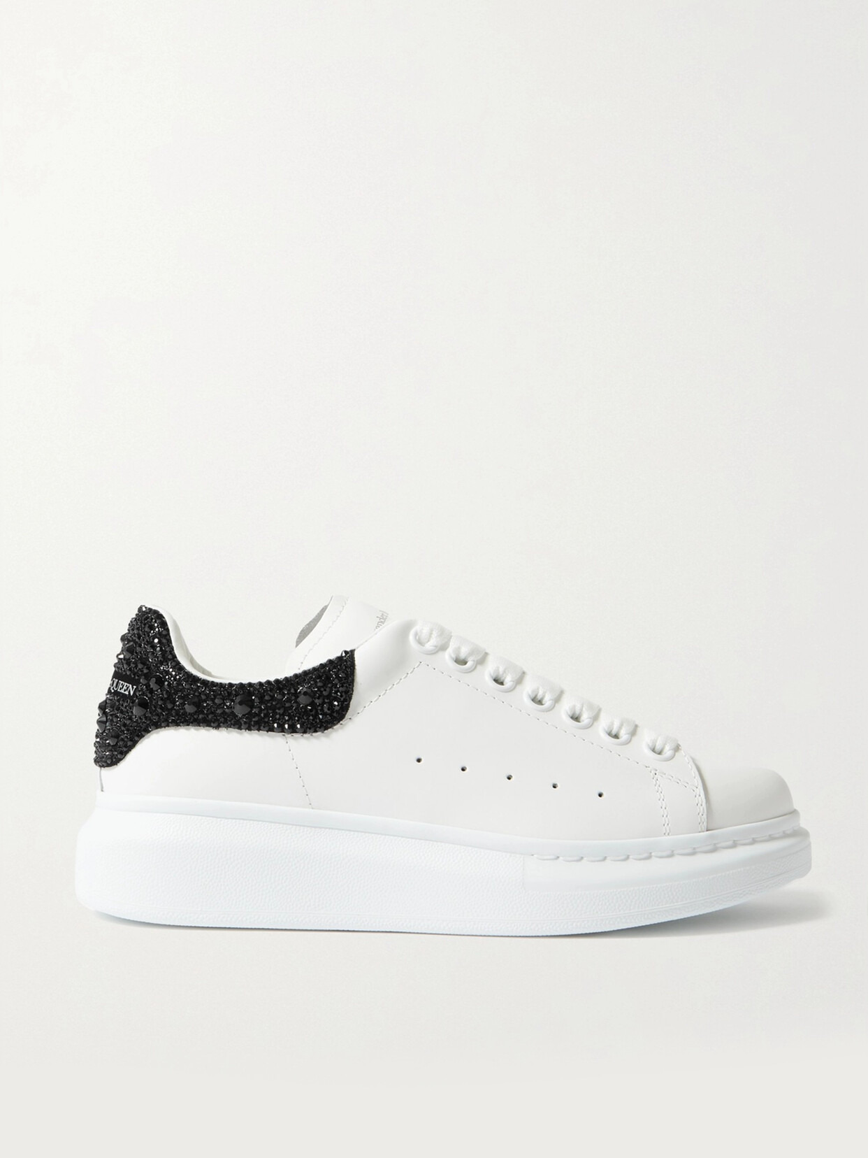Alexander McQueen's exaggerated-sole sneakers made their debut on the runway almost a decade ago. A modern-day classic, this iteration has been made in Italy from white and black leather with crystal-embellished heel tabs for a subtle touch of sparkle.