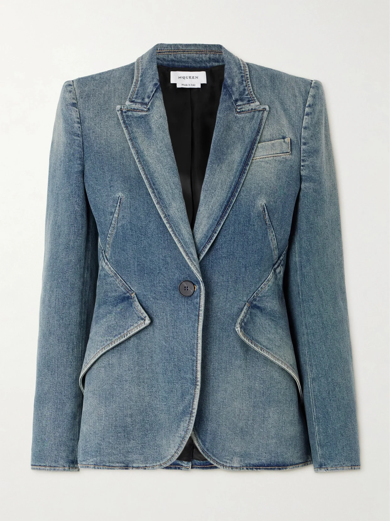 Alexander McQueen's blazer is made from denim that's faded for a lived-in look. It has sharp pointed shoulders, strategically placed seams and V-shaped paneled sides that create a flattering hourglass shape. Wear yours with tonal jeans.