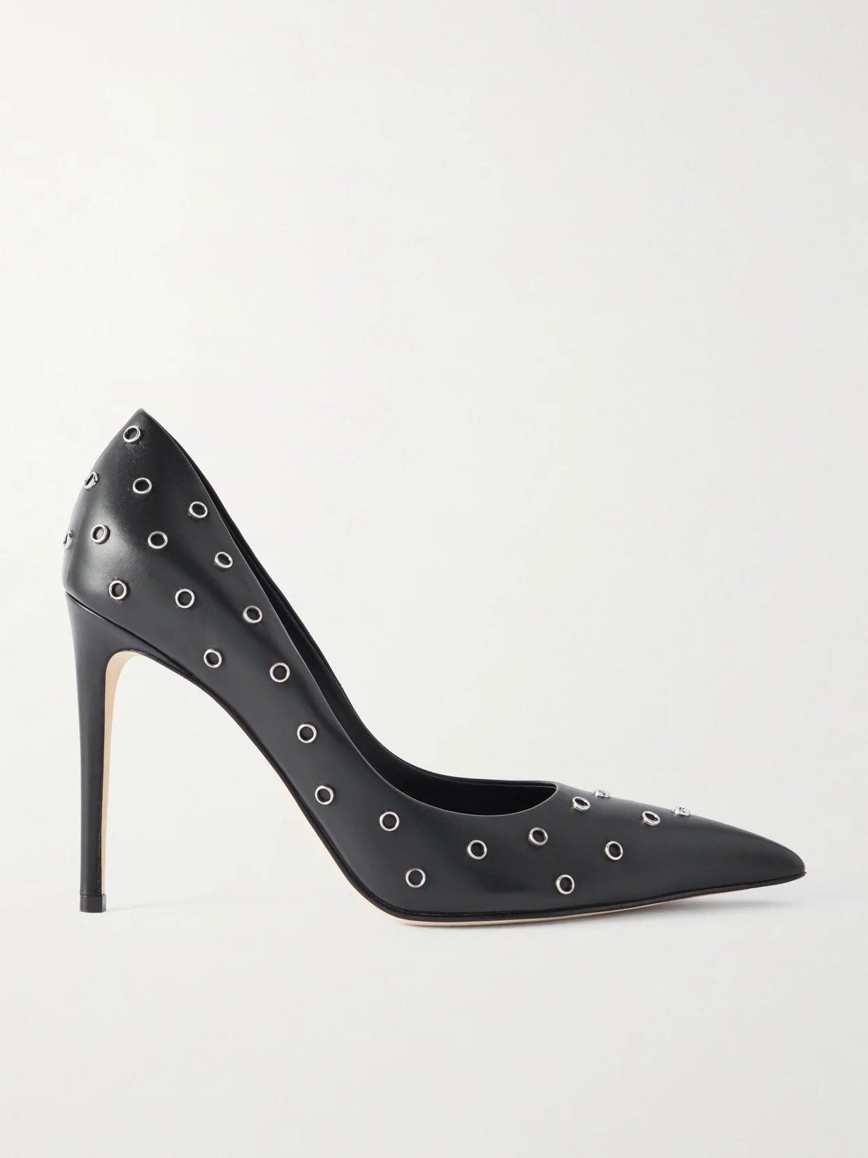 McQueen's pumps are embellished with the silver-tone eyelet embellishments. They're made from smooth leather with sleek pointed toes and rest on slender stiletto heels. Large to size. See Size & Fit notes.