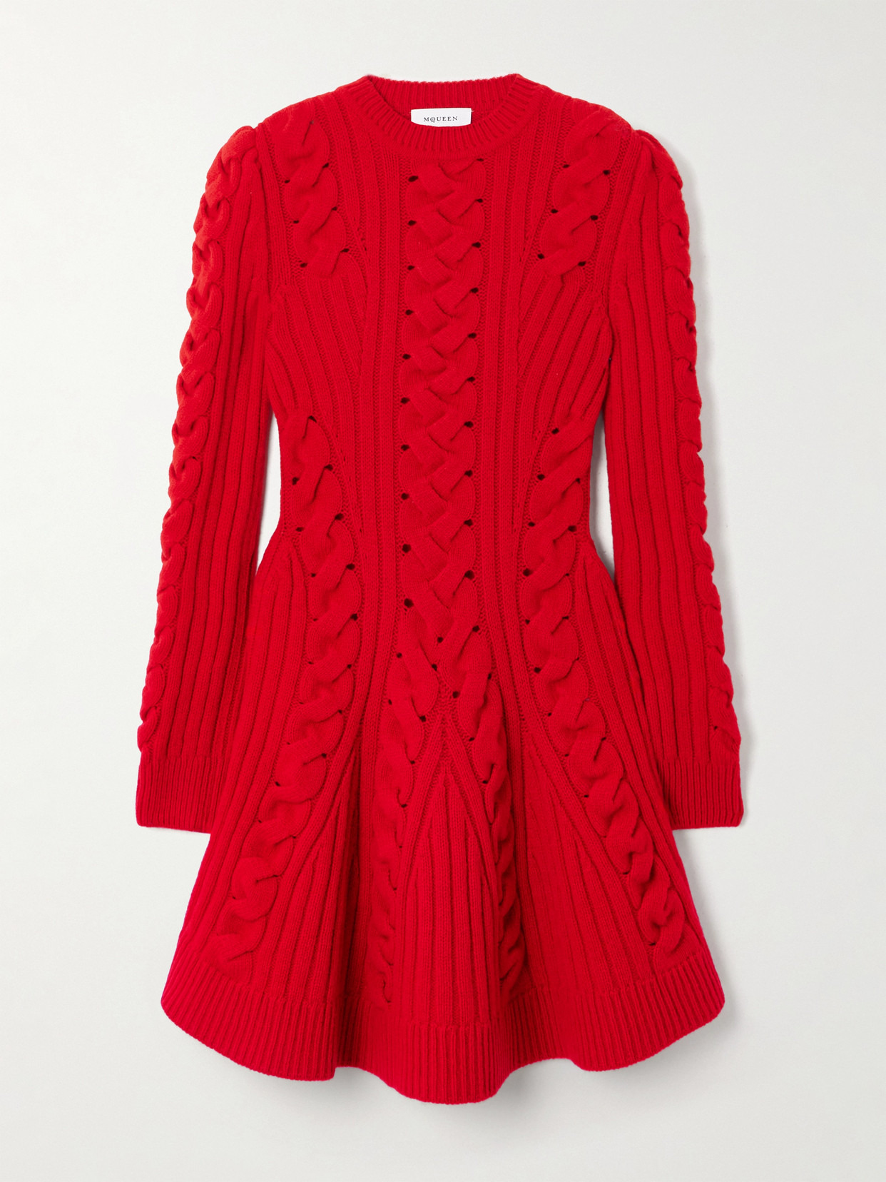 McQueen's dress has a tactile ribbed and cable-knit finish that accentuates the slim fit and reveals hints of skin underneath. It's made from wool and cashmere-blend in a vibrant red and has a flowy mini skirt.