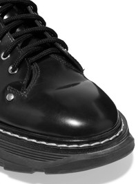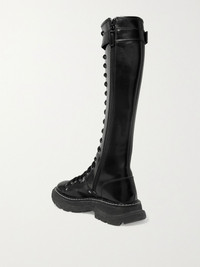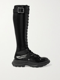 Alexander McQueen's combat-inspired boots go with everything from romantic dresses to coats and sharp tailoring. This knee-high pair is made from glossed-leather and has chunky rubber soles seemingly borrowed from hiking shoes. The zips prevent having to fuss with the laces and buckles. Size & Fit - Fits true to size, take your normal size - Italian sizing Details & Care - Platform sole measures approximately 35mm/ 1.5 inches - Black glossed-leather (Calf) - Zip fastening along side
