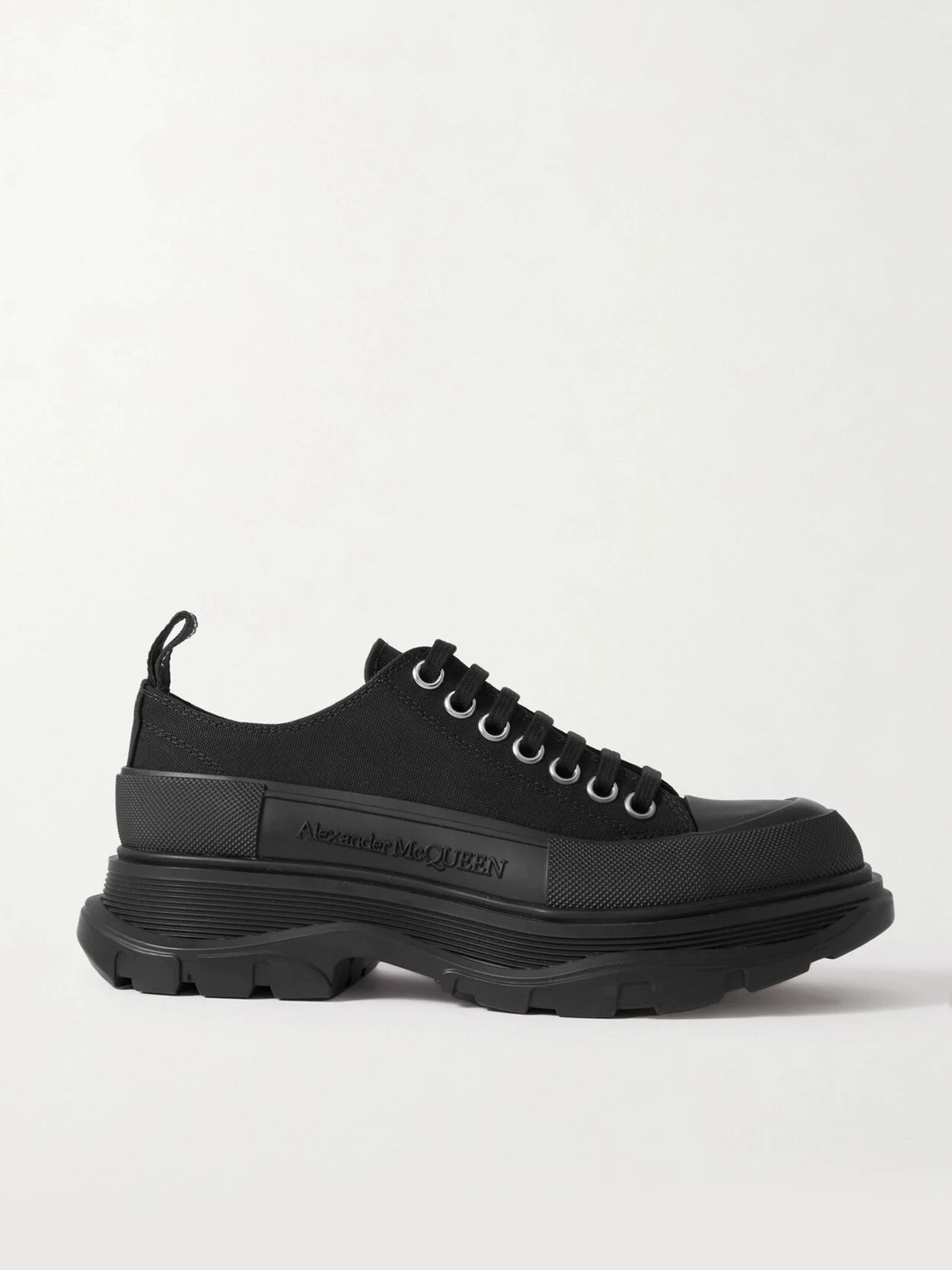 Sneakers have done a full 180 in terms of purpose and styling - gone are the days when we reserved them solely for the gym. Perfect for toughening up floaty dresses, Alexander McQueen's pair is made from black canvas and set on exaggerated rubber soles.