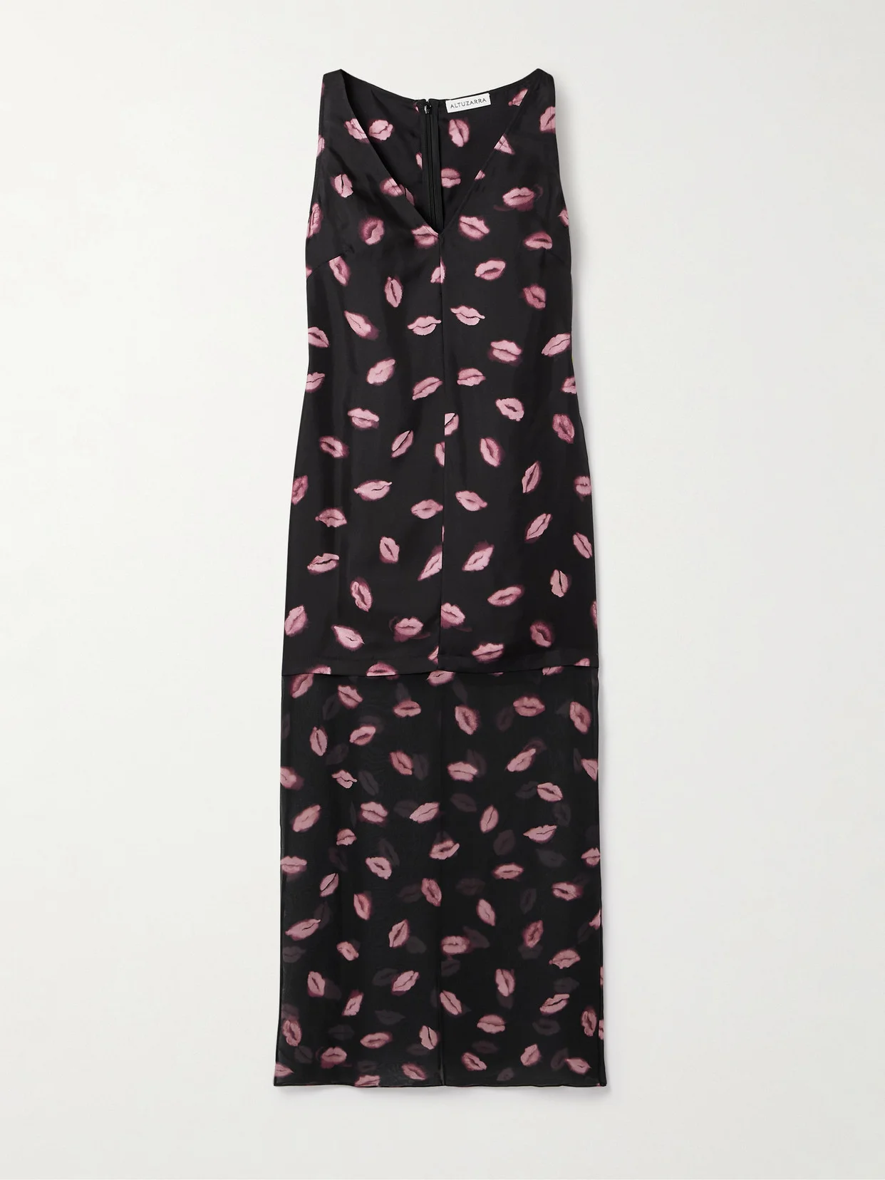 Altuzarra's 'Katrin' dress is from the label's Fall '25 collection, which draws inspiration from love letters and mementos. Printed with playful lips, it has an extended silk-twill bodice with a sheer chiffon skirt layered underneath.