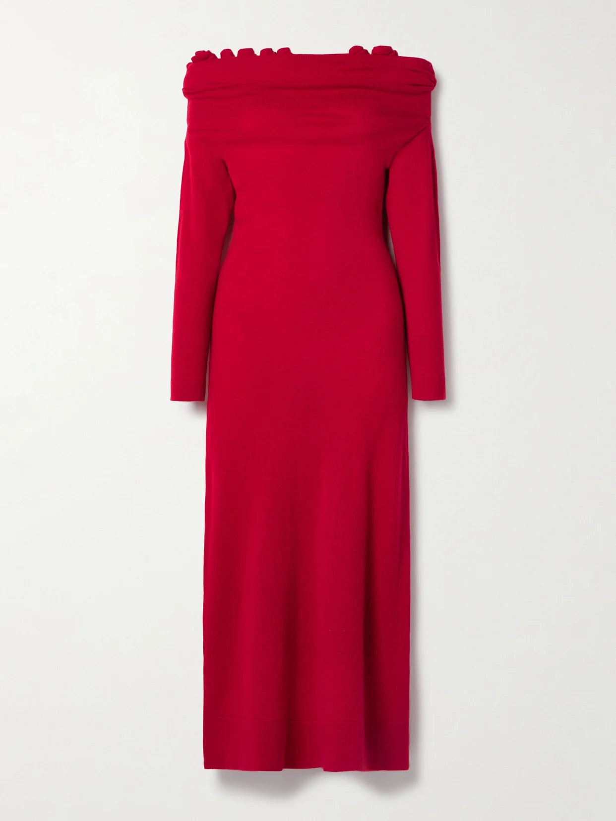 Altuzarra's otherwise muted palette for Fall '24 was offset by vibrant pops of color, like the 'Grenadine' shade of this dress. Featured on the runway, it's spun from incredibly soft cashmere and has an off-the-shoulder neckline appliqued with pretty rosettes.
