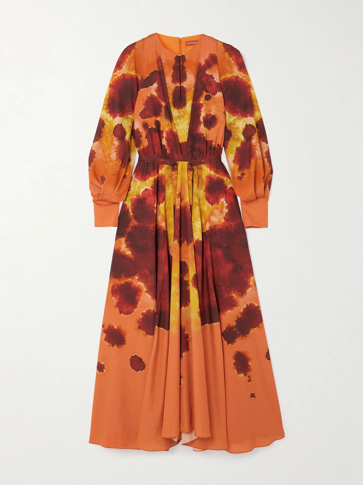 Altuzarra's chiffon midi dress has been patterned in Italy with brilliant sunset shades. Designed with a flouncy silhouette defined by an elegant tie at the waist, it has flowy sleeves tapered by crisp cuffs. The neckline features an understated keyhole that shows off a sliver of skin.