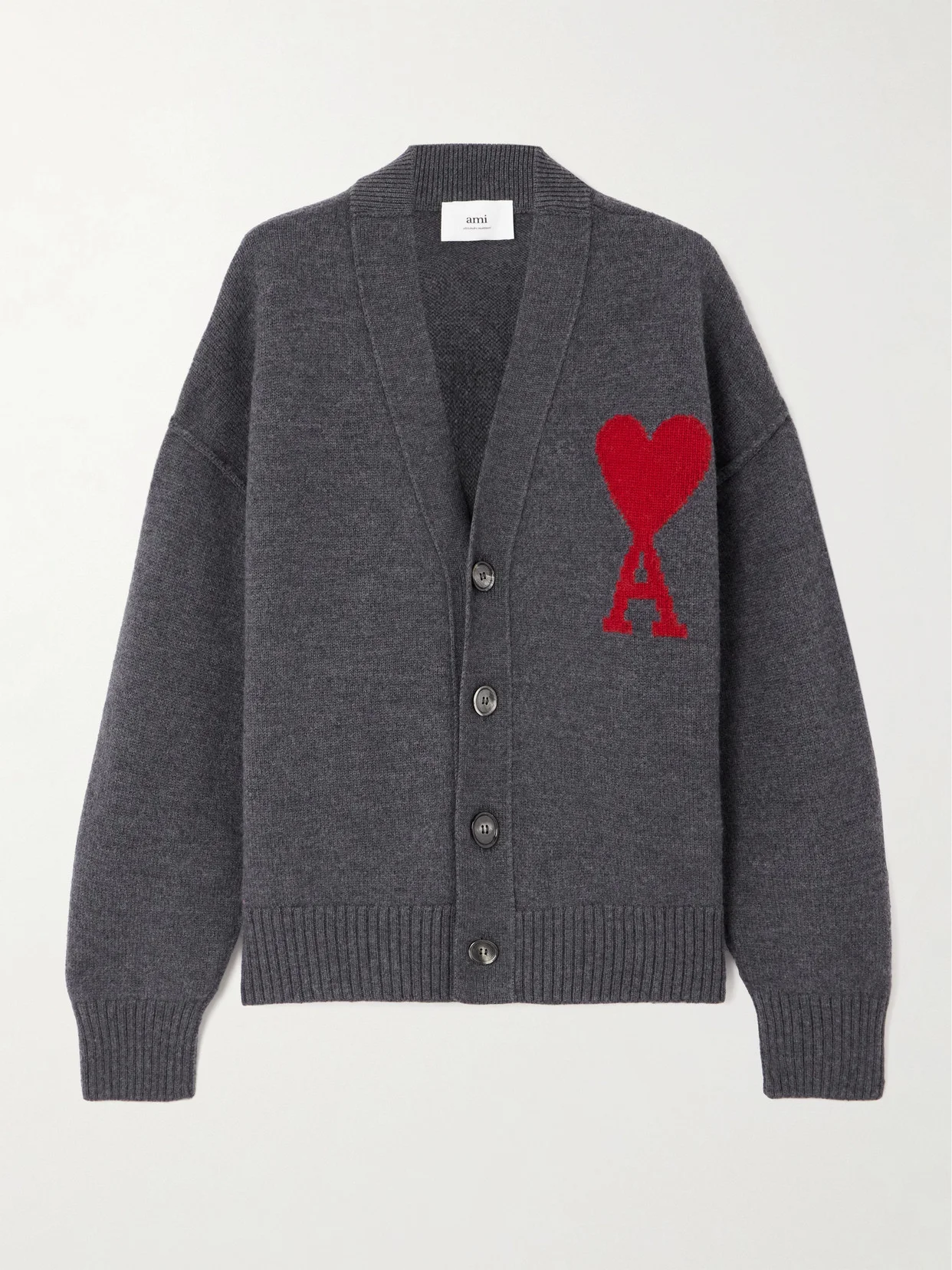 AMI PARIS' cardigan is spun from sumptuous wool in a preppy, relaxed shape. It's intarsia-knitted with the label's 'Ami de Caur' motif' in red which fans of the brand will love. An easy layering piece, wear yours over shirts and tanks alike. This product supports best practice in Animal Welfare. Find out more about NET SUSTAIN here.
