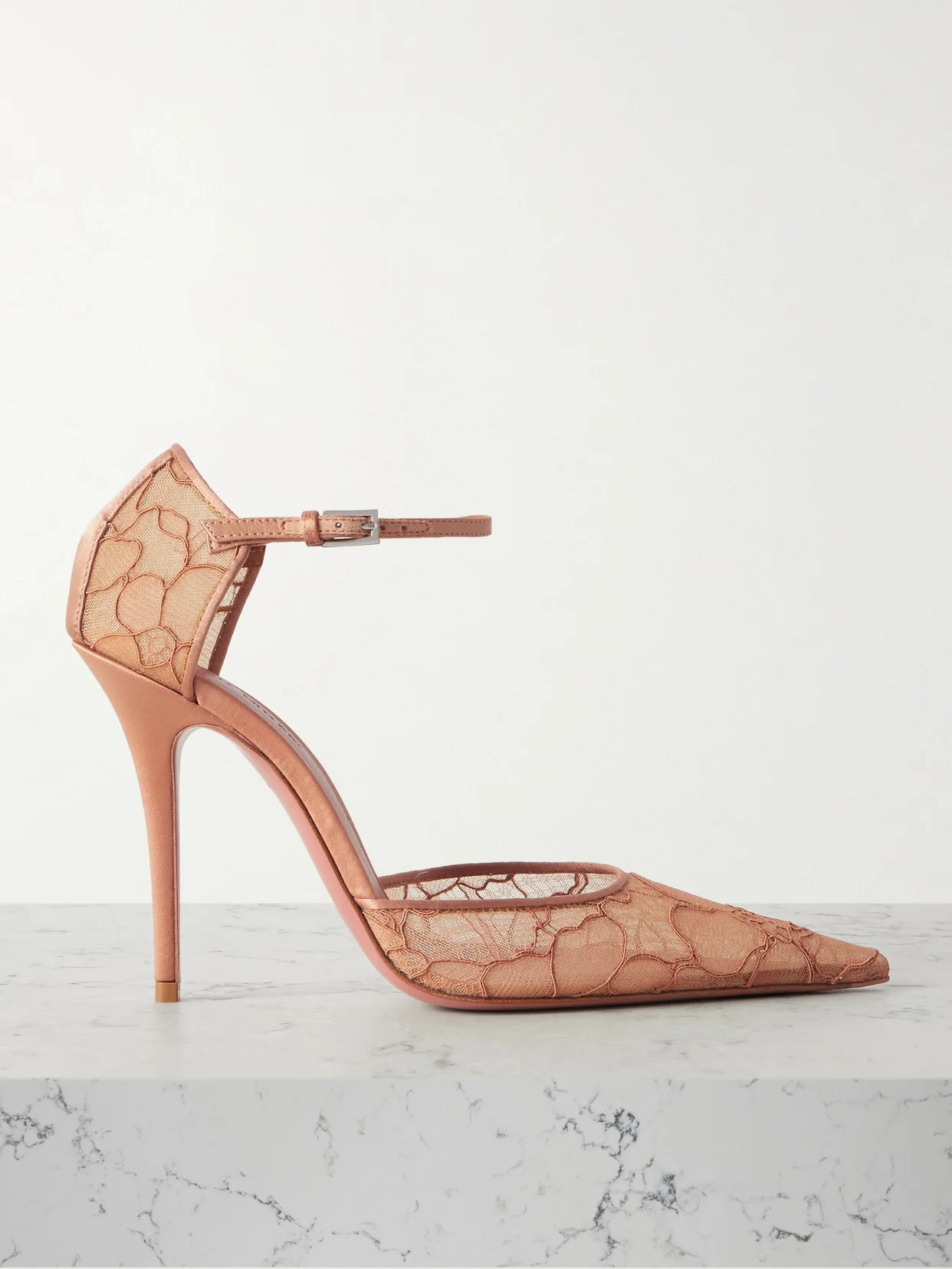 Amina Muaddi's 'Barbara' pumps embody sweet, romantic style with their antique-rose shade and intricate details. They're made from delicate corded lace trimmed with satin and have pointed toes and slim, adjustable ankle straps. The stiletto heels offer 105mm of lift.