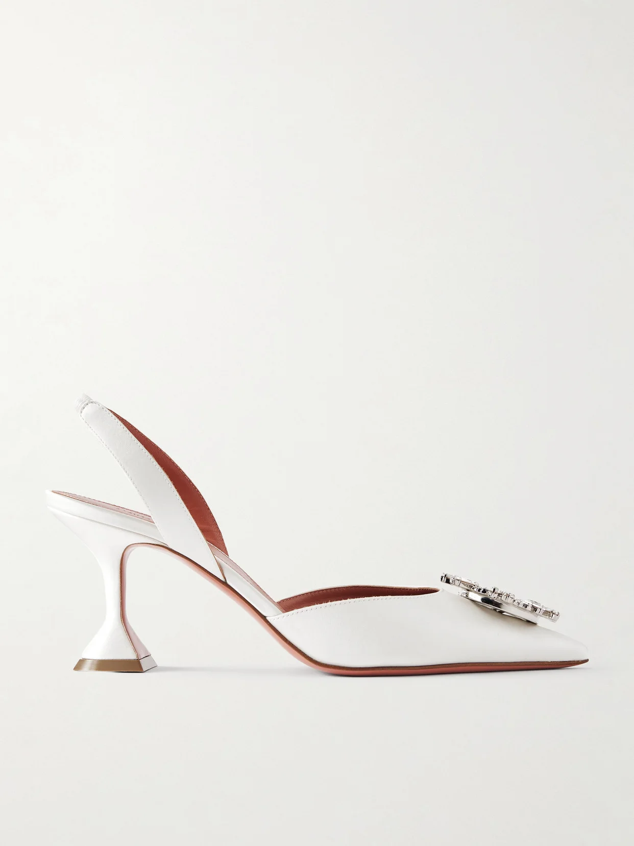 Amina Muaddi is all about having fun with fashion but that never comes at the cost of impeccable craftsmanship. These 'Begum' pumps have been made by Italian artisans from ivory satin and are set on the label's signature fluted heels. Match your earrings to the glittering Art Deco-inspired brooches that adorn the pointed toes.