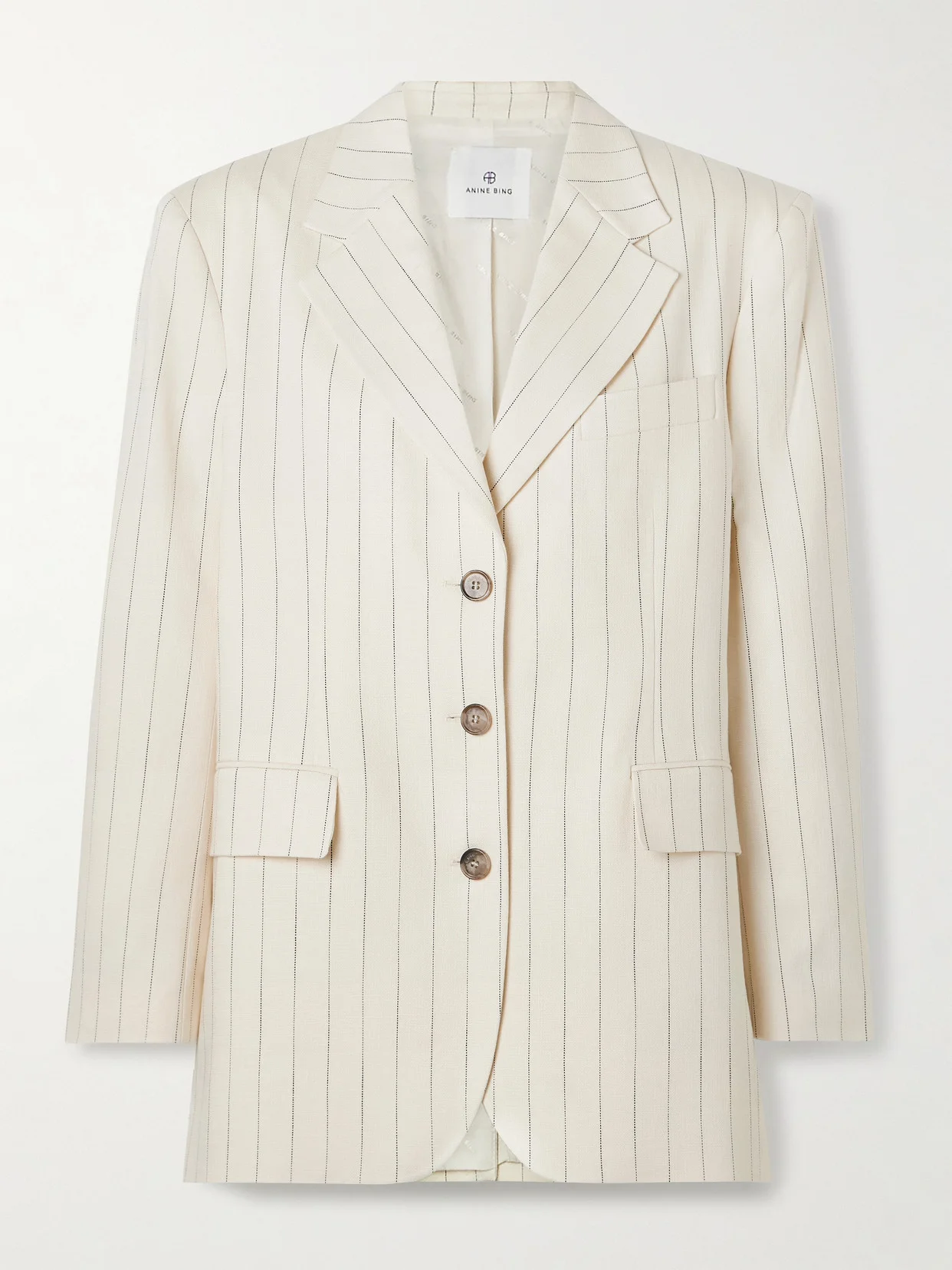 Anine Bing's ‘Sara' blazer is a timeless, versatile style you'll turn to for years. Woven with slim pinstripes, it's cut for an oversized fit and has elegant notch lapels and flap pockets. Wear yours with everything from dresses to jeans.