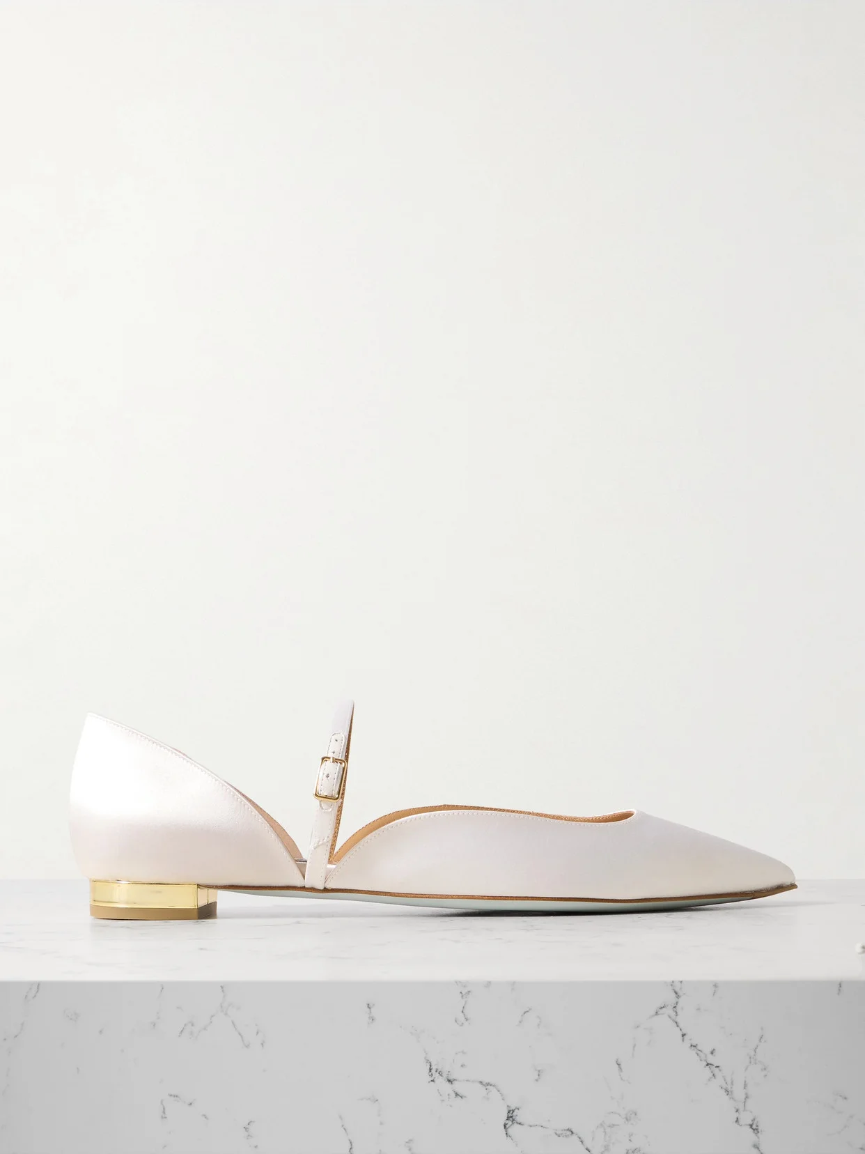 You needn't compromise on glamour or comfort on your special day with Aquazzura's 'Bellezza' ballet flats. They're made from white satin with softly pointed toes and a slim buckled strap. The gold-tone heels will compliment your new wedding band.