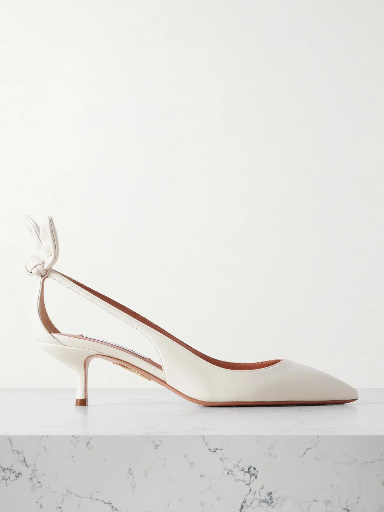 Aquazzura's chic but playful pumps are the perfect choice for formal events. Expertly crafted in Italy from smooth leather, they rest on low 50mm heels and have cutouts at the sides that follow the natural lines of the foot. Style yours with midi hems to showcase the sweet bows.