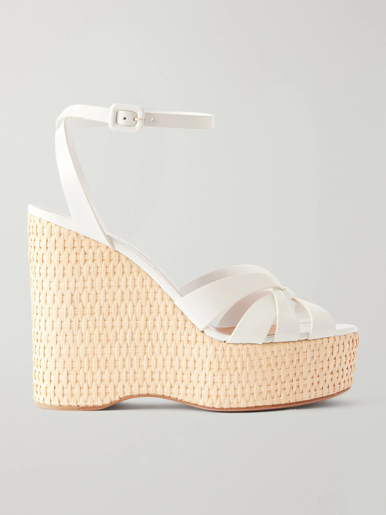 The 'Copacabana 130' wedge by Aquazzura contrasts smooth leather with a woven raffia sole, creating a tactile interplay of structure and texture. The sculpted platform elevates the silhouette, while the slim ankle strap keeps the overall feel clean and balanced.