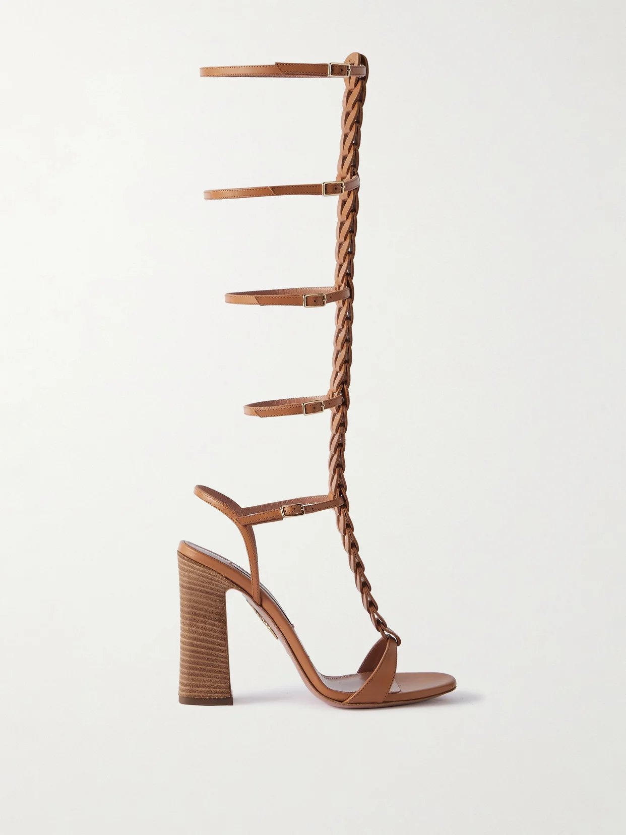 Aquazzura's 'Destiny' sandals are inspired by timeless gladiator styles. Made in Italy from sand-colored leather, they have braided T-bar straps and reach to a calf length. They're set on stacked 105mm heels for instant lift.