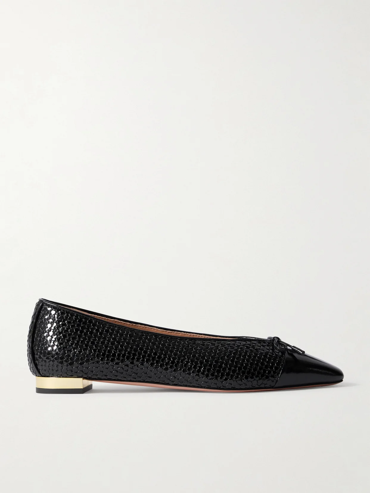 Aquazzura's 'Gioia' ballet flats are crafted from panels of smooth and textured glossed-leather for subtle contrast. They're topped with sweet bows and rest on slight gold-tone heels which you could match your jewelry to. Large to size. See Size & Fit notes.
