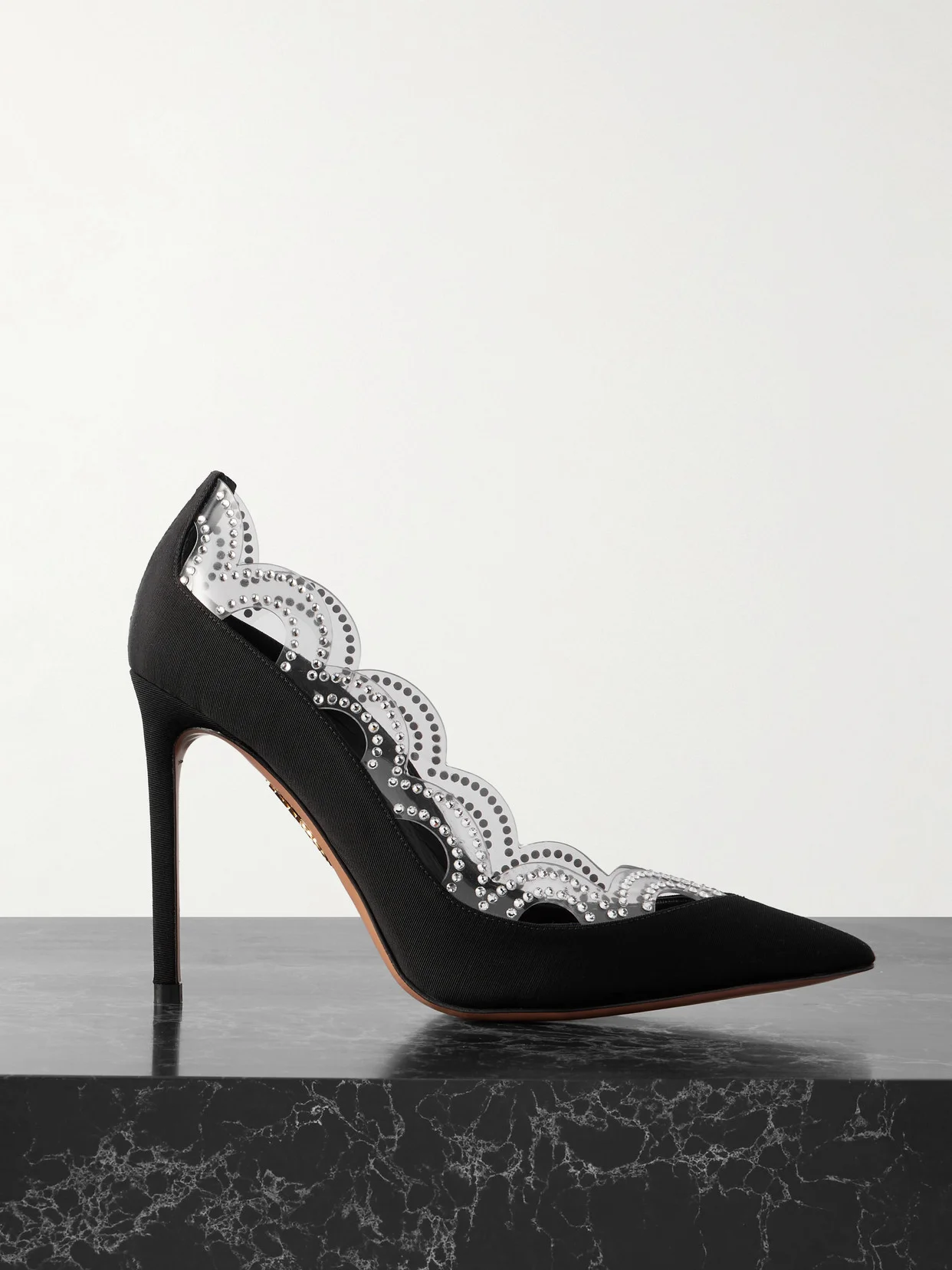 Aquazzura's 'Je T'Aime' pumps are made from lustrous grosgrain and traced with crystal-embellished clear PVC scalloped trims. They have elongating pointed toes and 105mm heels. Wear yours to elevate classic LBDs.
