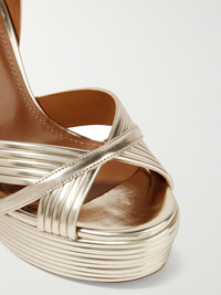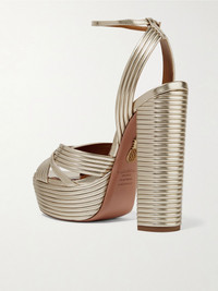 Aquazzura's glamorous 'Sundance' sandals have been made in Italy from shimmering gold leather that's stitched for a ribbed effect. They're set on a towering 140mm block heel that's balanced by a sturdy 30mm platform and have an adjustable ankle strap to customize the fit. Wear yours with cropped denim or patterned midi dresses. Size & Fit - Fits true to size, take your normal size - Italian sizing Details & Care - Heel measures approximately 140mm/ 5.5 inches with a 30mm/ 1 inch platform - Gold leather - Buckle-fastening ankle strap
