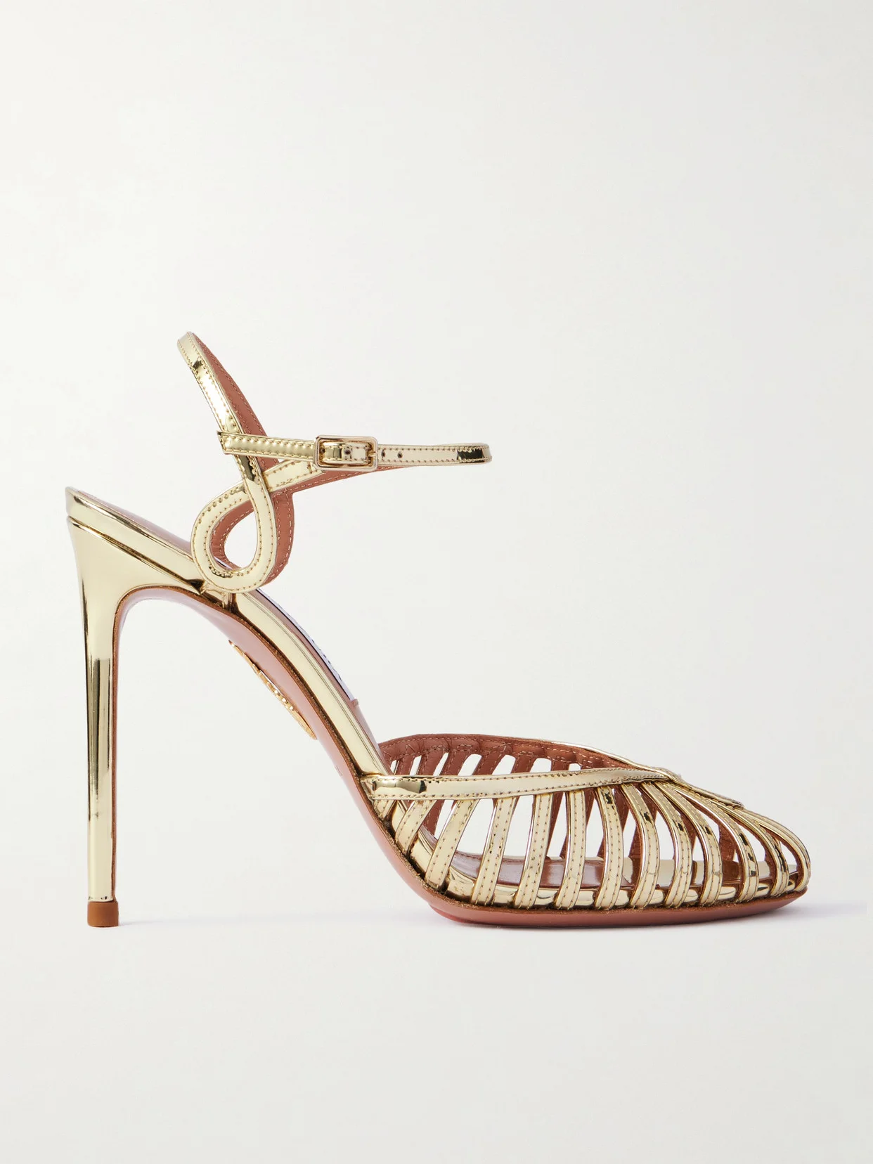 Aquazzura's 'Sweet Surrender' pumps have a cage-like design that calls to mind vintage styles. They've been made in Italy from gold mirrored-leather and set on 105mm stilettos.