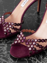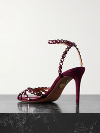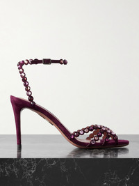 Aquazzura's 'Tequila' sandals are a glamorous choice for cocktail hour. Crafted in Italy from suede, they have a retro-inspired caged silhouette embellished with rows of sparkling crystals. The stiletto heels offer 85mm of lift. Size & Fit - Fits true to size, take your normal size - Italian sizing Details & Care - Heel measures approximately 85mm/ 3.5 inches - Dark-purple suede (Goat) - Buckle fastening ankle strap