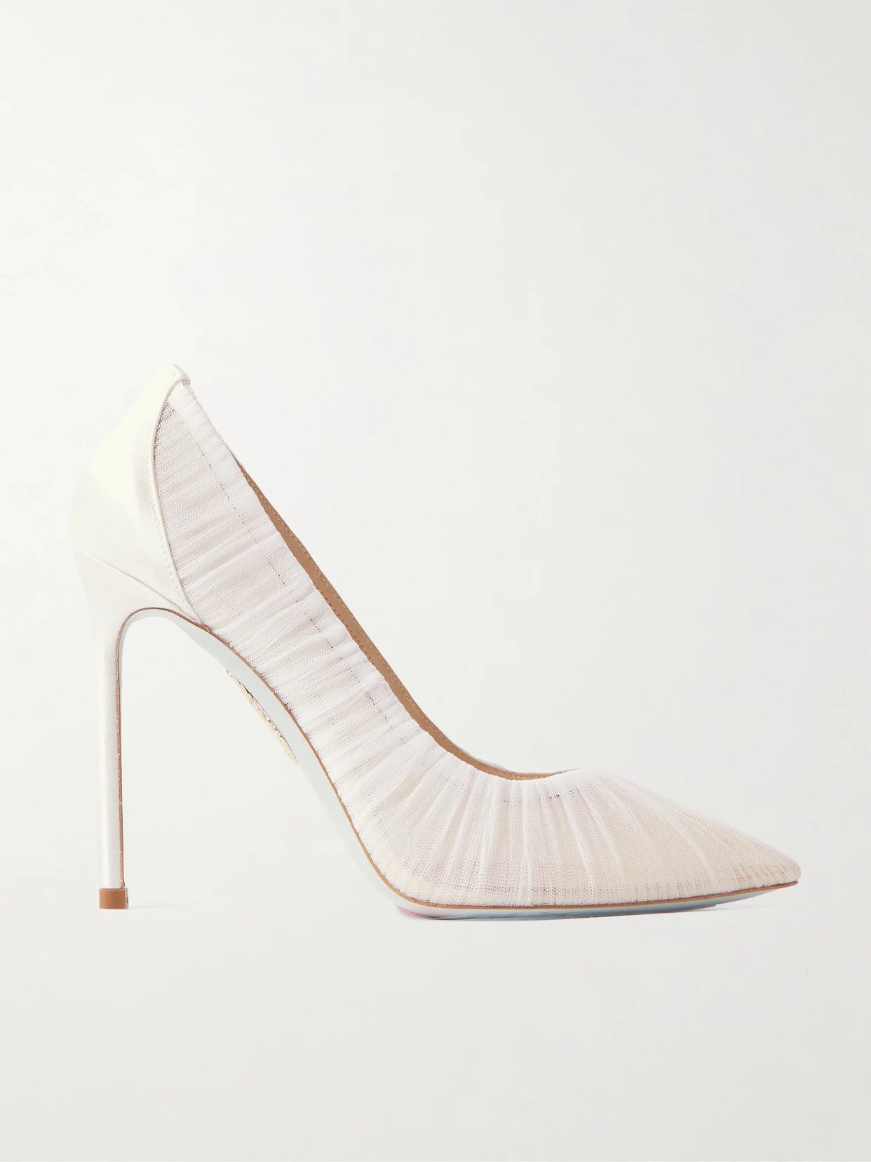 Aquazzura's 'Voile' pumps will add a whisper of modern glamour to any bridal look. They've been made in Italy from diaphanous tulle with satin trims and intricate pleating along the vamps. The 105mm heel will bring plenty of height to floor-sweeping gowns.