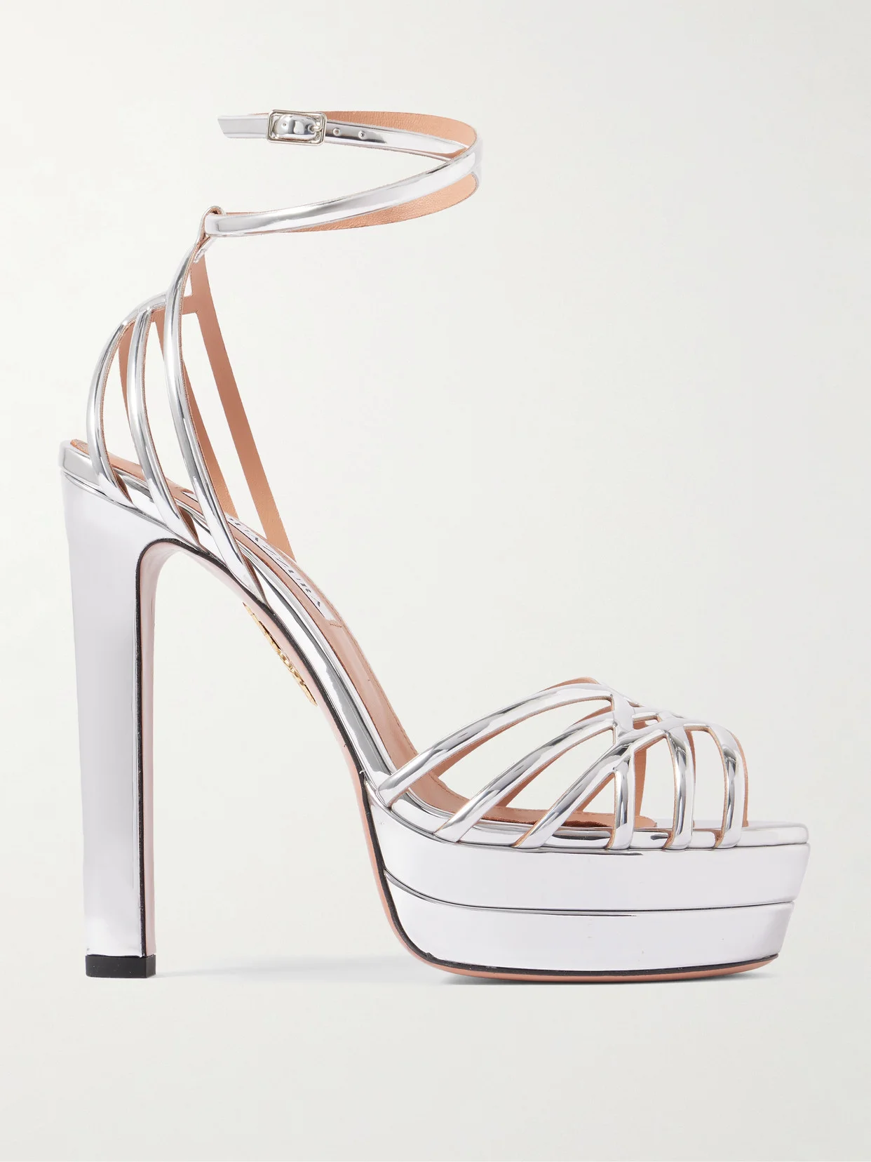 Aquazzura's 'Wild Dream' sandals have slim metallic straps that intersect to create an elegant, caged design. They rest on platform soles with a narrow block heel measuring 105mm. Style yours with bare legs or sheer black tights. Small to size. See Size & Fit notes.