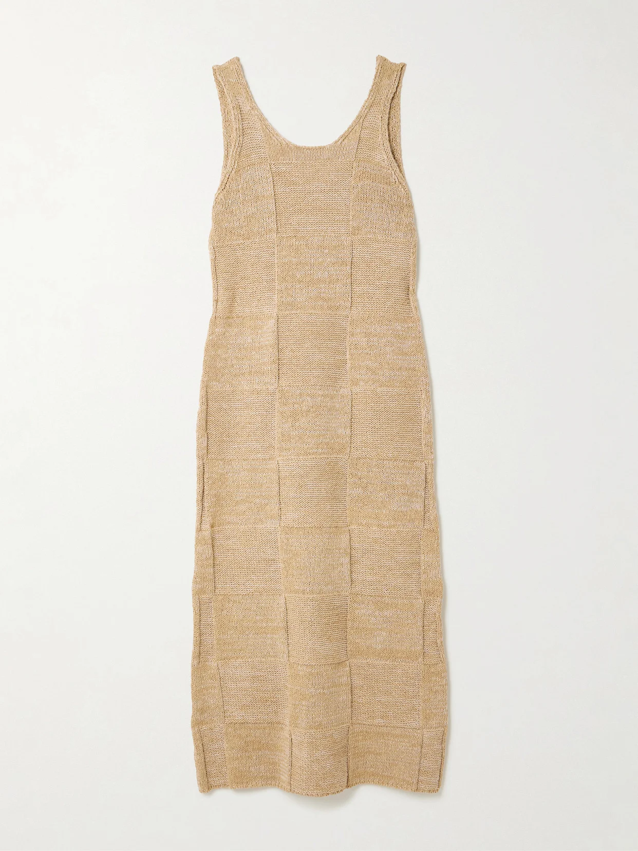 Debuted on Auralee's Spring '26 runway in Paris, this midi dress is knitted from airy cotton and linen-blend in a gridwork of tonal checked panels. Pull focus to the squared neckline with a dainty chain, or layer it under the matching cardigan to echo the show styling.