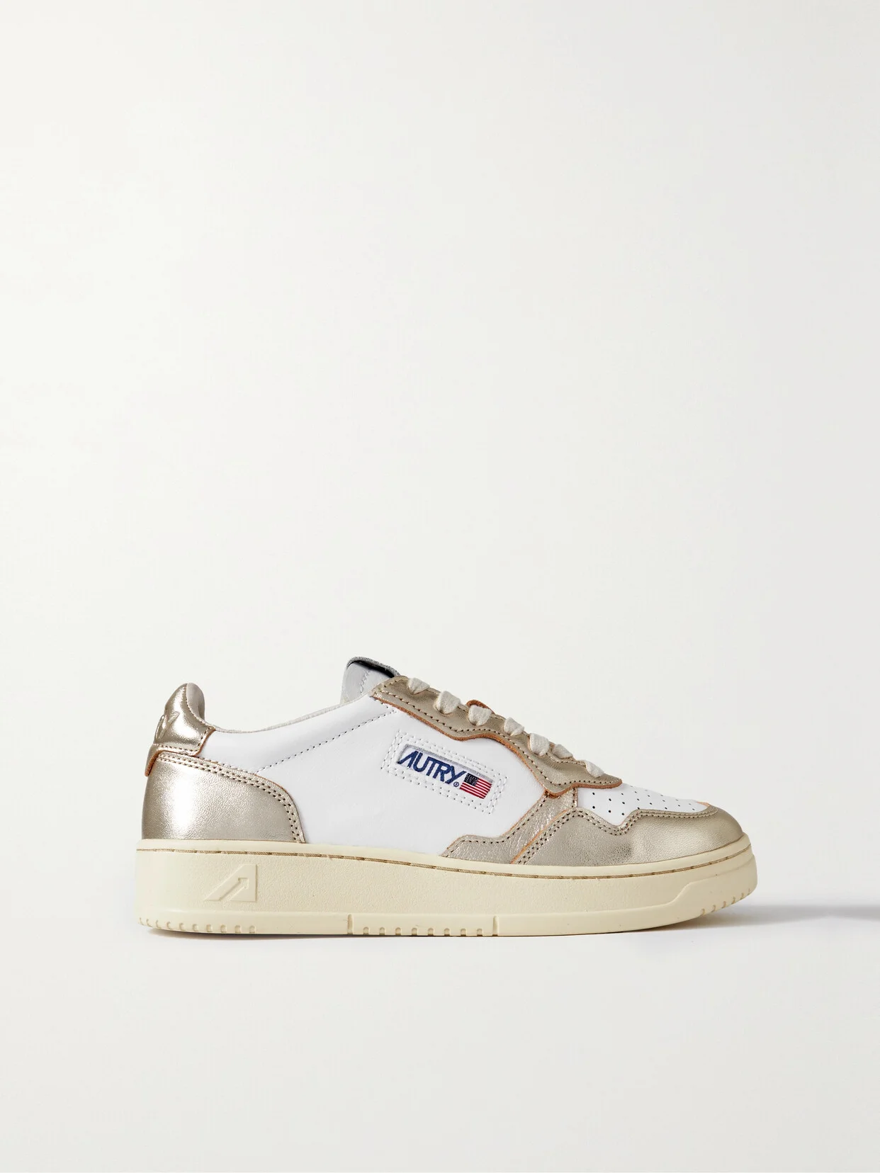 Autry's 'Medalist Low' sneakers are based on vintage styles from the '80s. Set on comfortable rubber soles, they're made from contrasting panels of smooth leather with a perforated toe and a padded ankle collar. The American flag logo at each side is a brand signature.