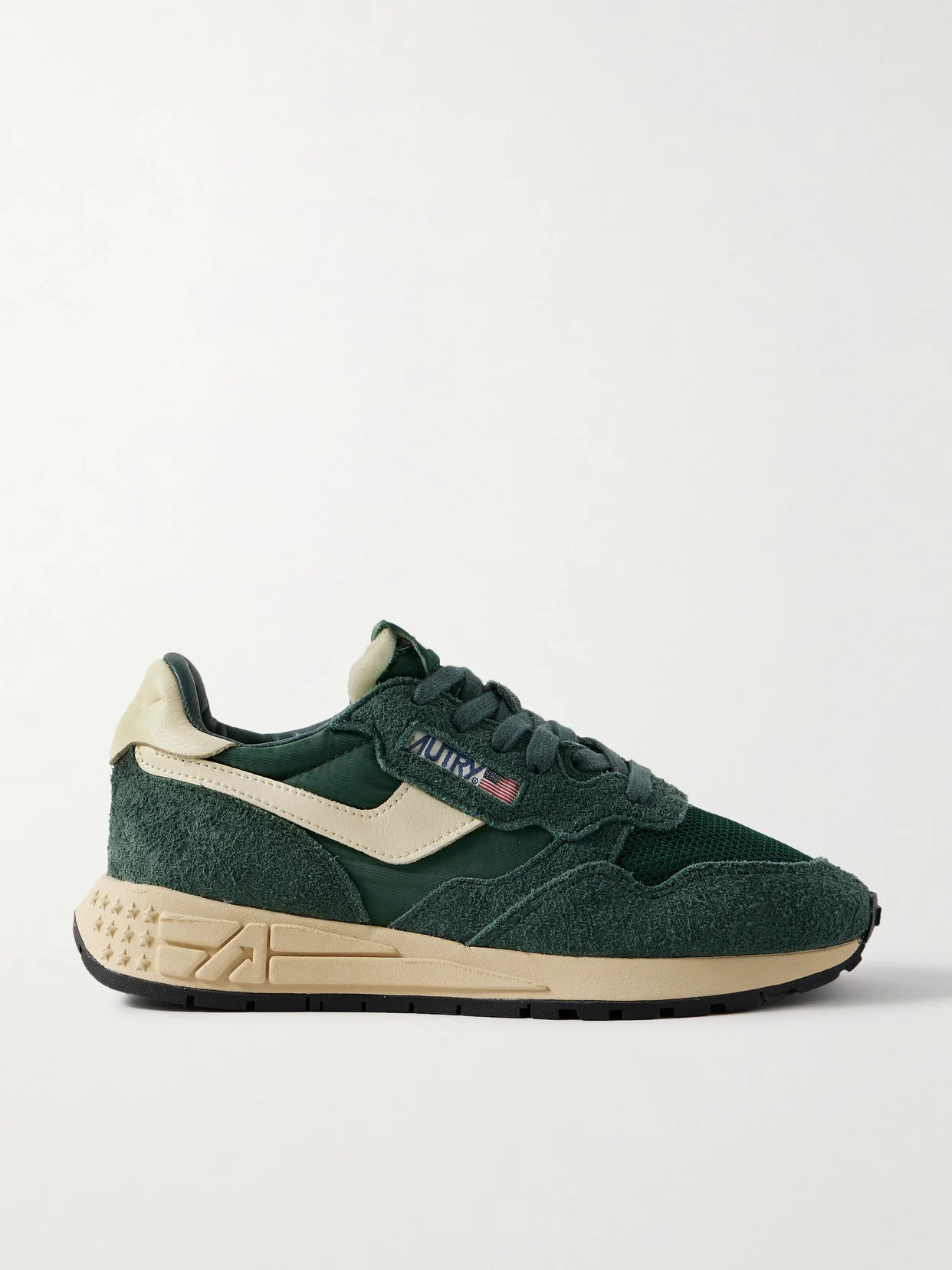 A nod to its '80s aesthetic, Autry's 'Reelwind Low' sneakers are made from panels of shell and brushed suede for a retro feel. They have textured-leather trims and bouncy Phylon soles that offer plenty of traction. The flag logo and debossed stars pay homage to the brand's American heritage.