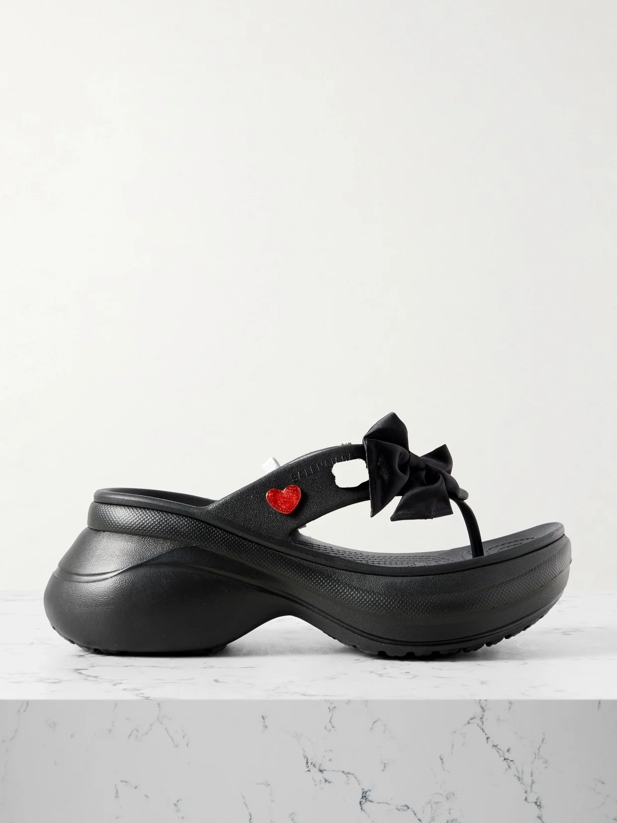 Balenciaga's collaboration with Crocs™ channels Y2K style. A real conversation-starter, these EVA rubber flip flops have toe posts with bows on top, as well as Jibbitz™ charms, which can be removed if you prefer. They're set on curved 45mm platforms.