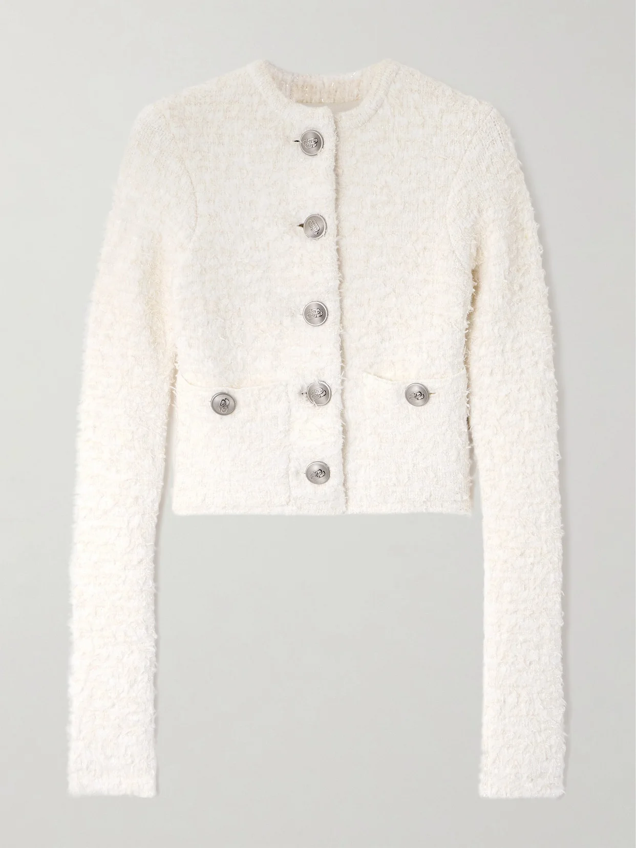Balenciaga's cropped cardigan has been made in Italy from white cotton-blend tweed flecked with with sparkling metallic threads. The front is detailed with silver, logo-stamped buttons. Wear yours with the matching mini skirt.