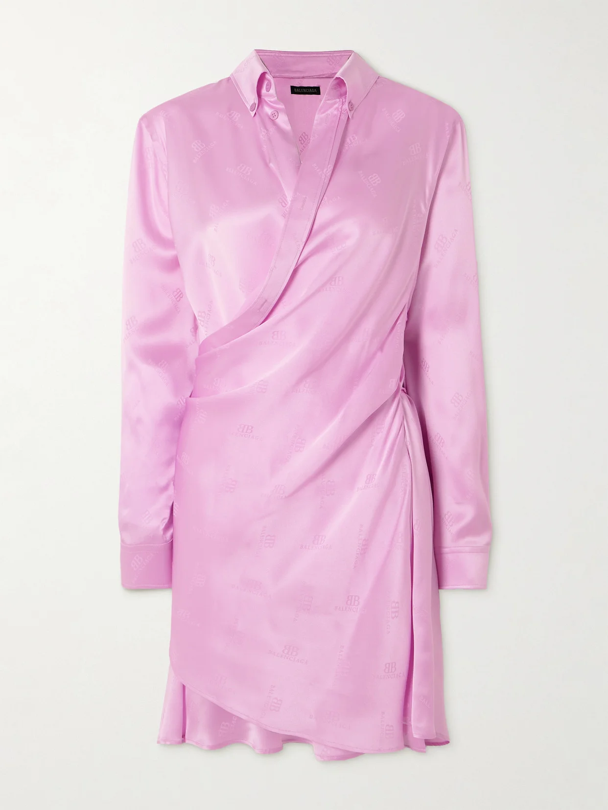 Under the right light, Balenciaga's name flashes in stripes across this mini dress. It's made from logo-woven jacquard silk in a draped wrap silhouette. The beaming pink is a real mood-lifter.